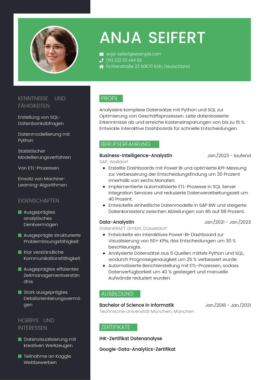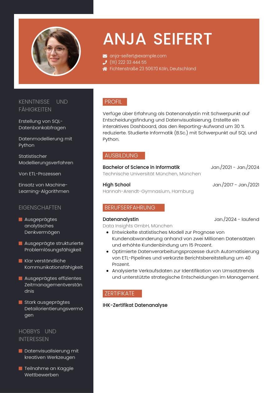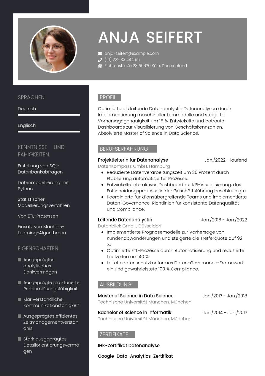 Nachdem wir die wichtigsten Inhalte für deinen Lebenslauf als Datenanalyst im Detail besprochen haben, werfen wir nun einen Blick darauf, wie du alles aussagekräftig und professionell miteinander kombinieren kannst. Im folgenden Beispiel siehst du, wie die oben diskutierten Informationen in eine fertige Vorlage eingeflossen sind – das Endergebnis sieht so aus.