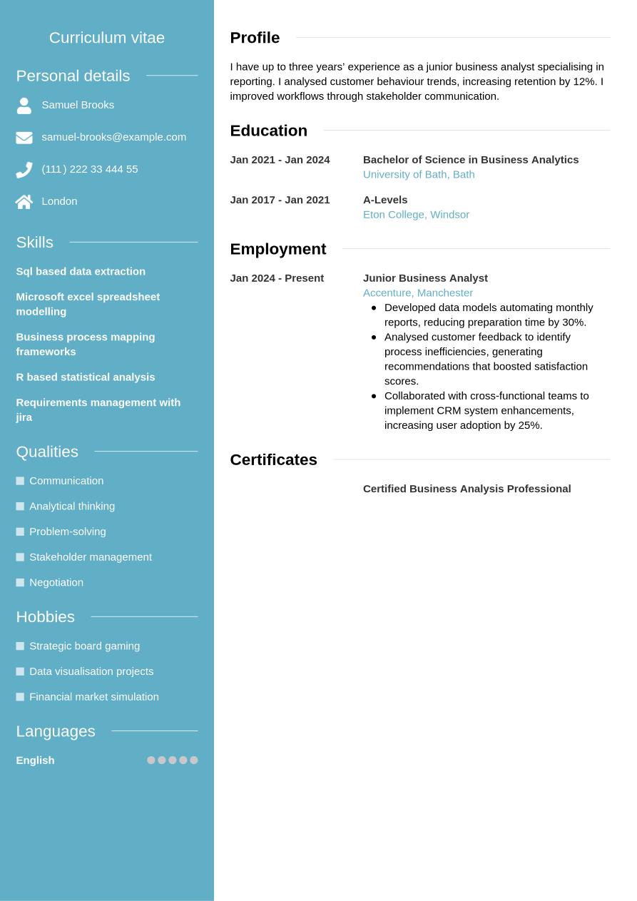 Now you know how to create a business analyst CV for maximum impact, take a look below at this full, completed example: