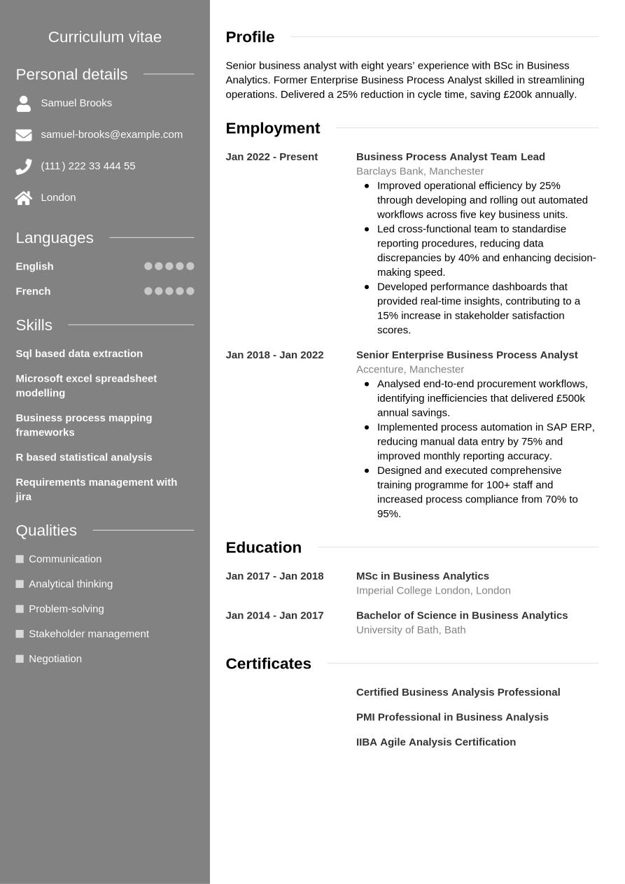 A good CV summary would typically focus on a couple of key skills that match the job description, demonstrating how you've used them to good effect in previous roles. It's important to focus on your unique qualities and provide a preview of how they've made an impact in your career to date, which you'll unpack later in the document. Below you'll find a good example of how to write an effective business analyst CV summary. The example shows quantifiable achievements and well-structured sentences.