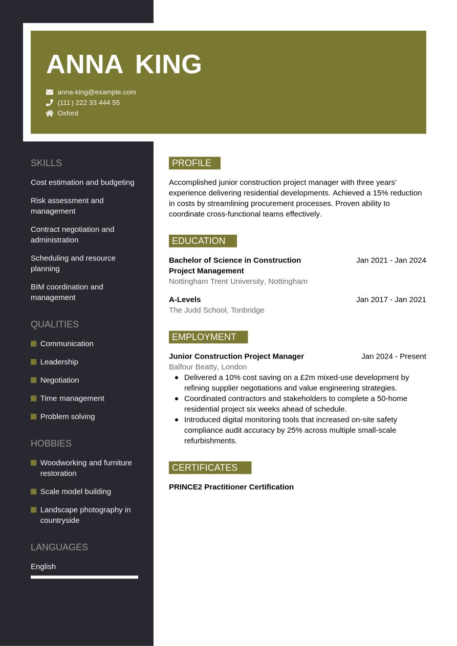 If you're an entry-level candidate with no relevant work experience, focus on your soft and transferable skills in your construction project manager CV. Employers will be looking for candidates who can show they have the soft skills to learn a new role and adapt to new environments.
