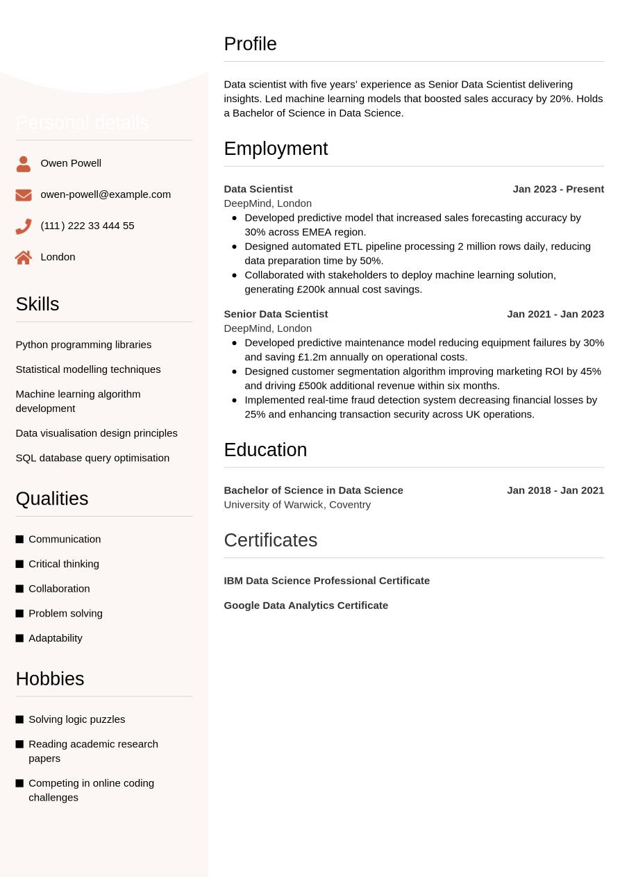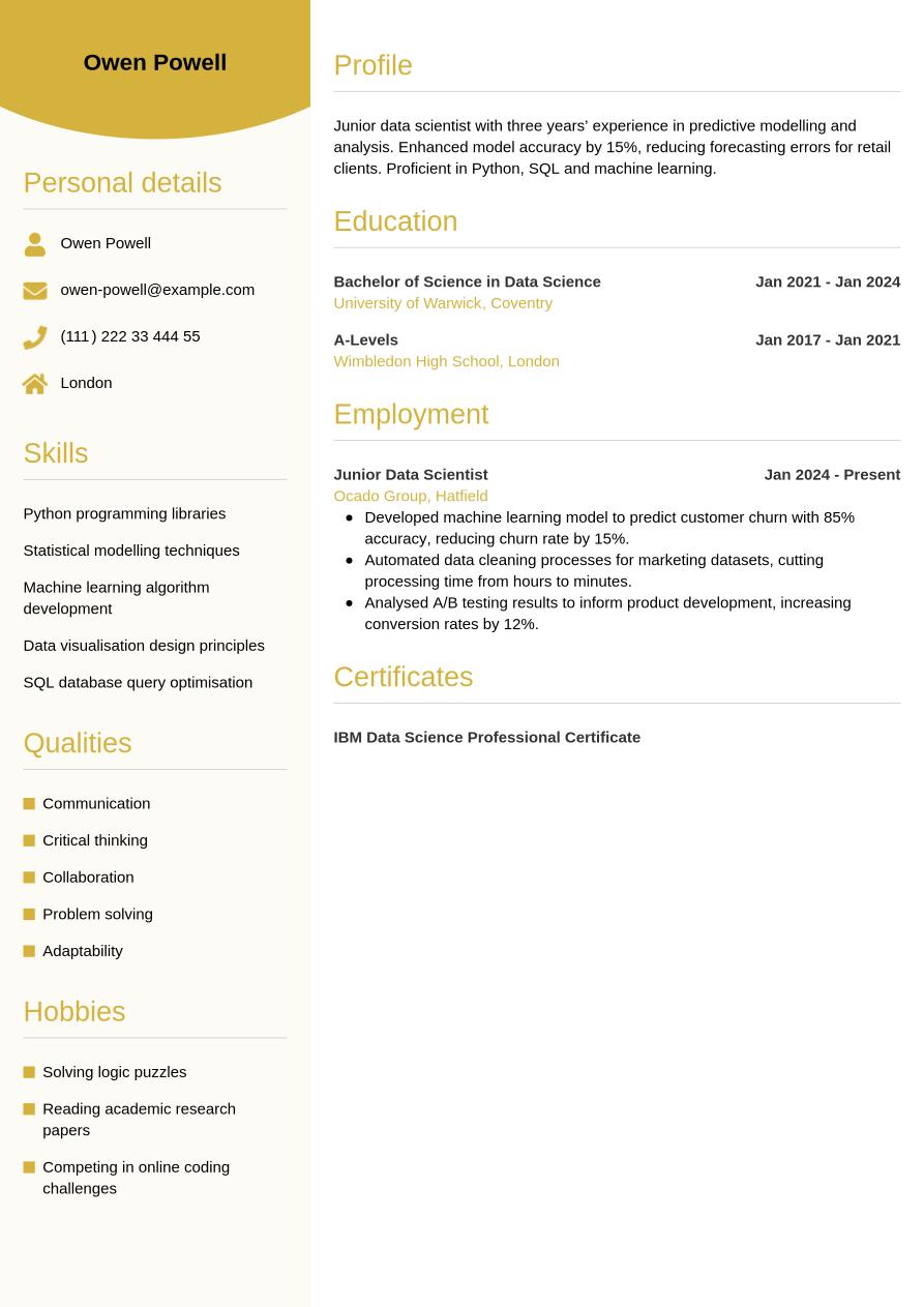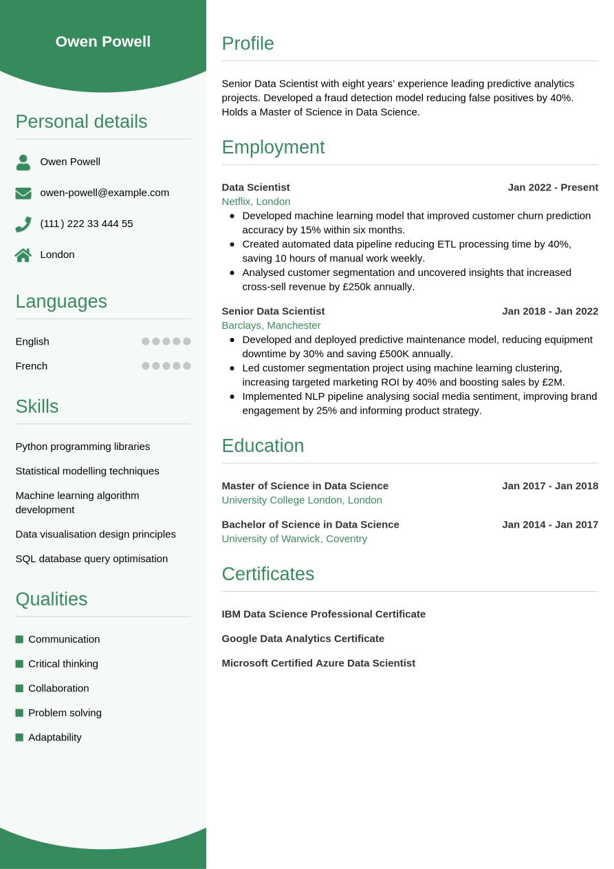 Now that you know exactly what to include in your data science CV, we can take a look at a final, finished example below: