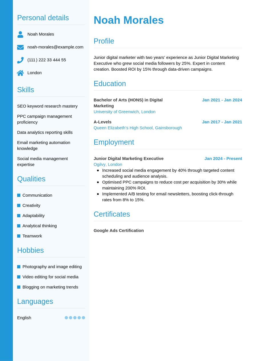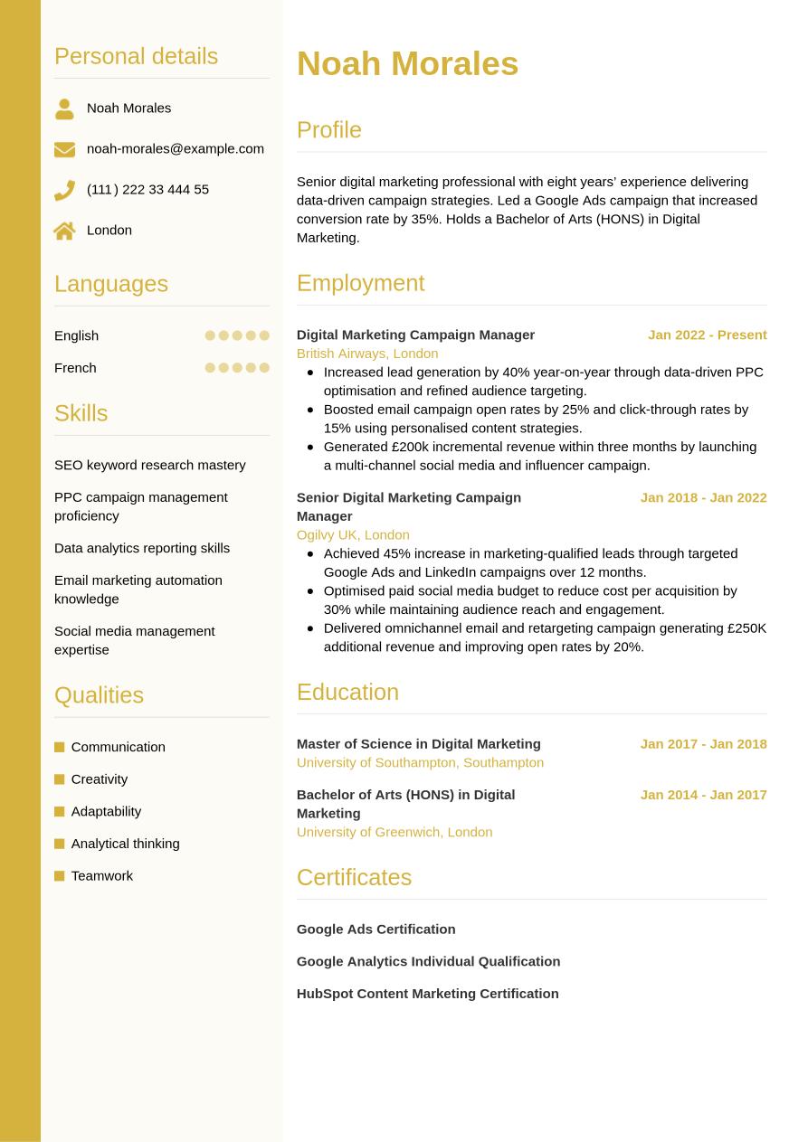 Now we've shown you everything that needs to go into your digital marketing CV, we can take a look at how it comes together in its final form in the following example: