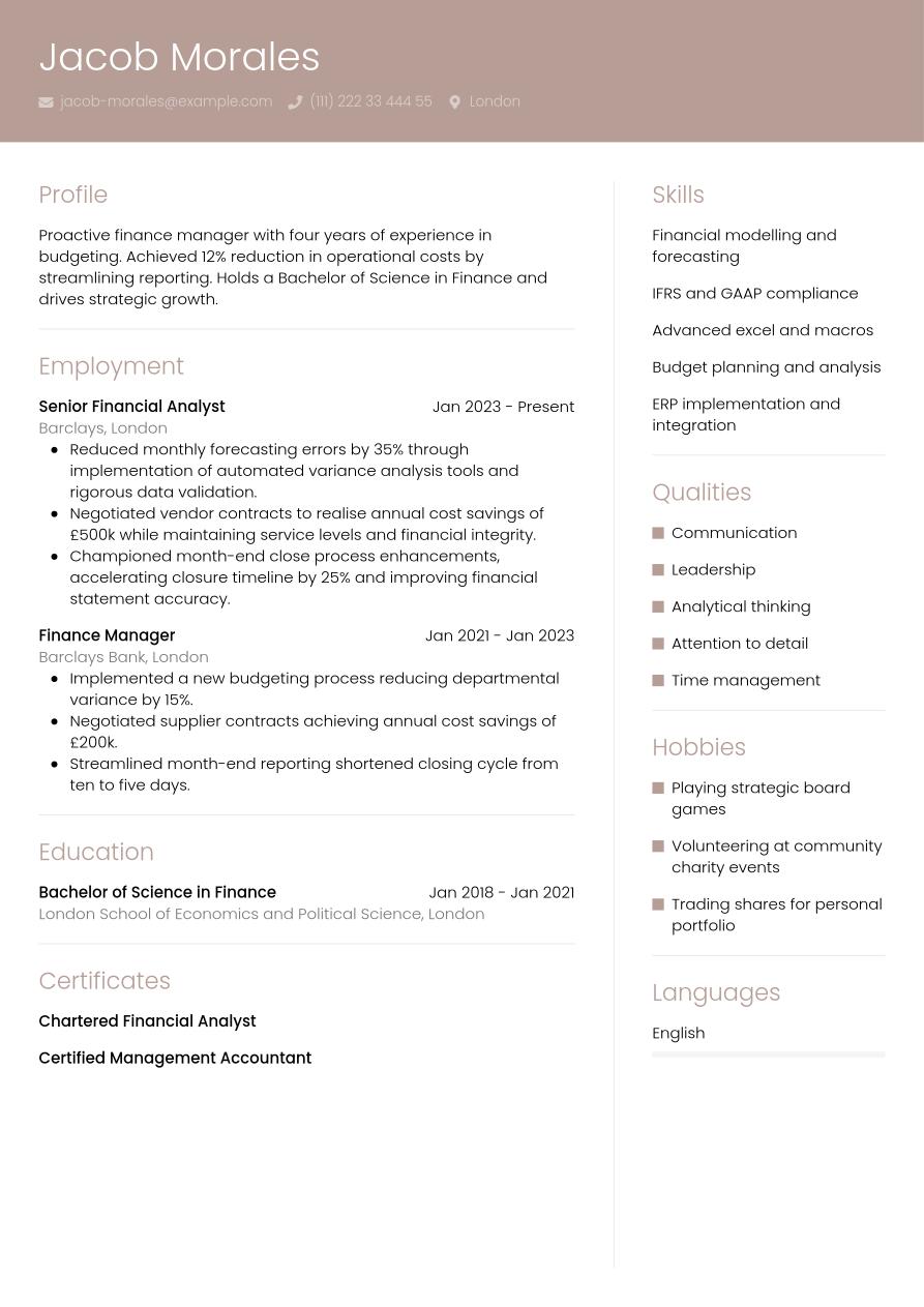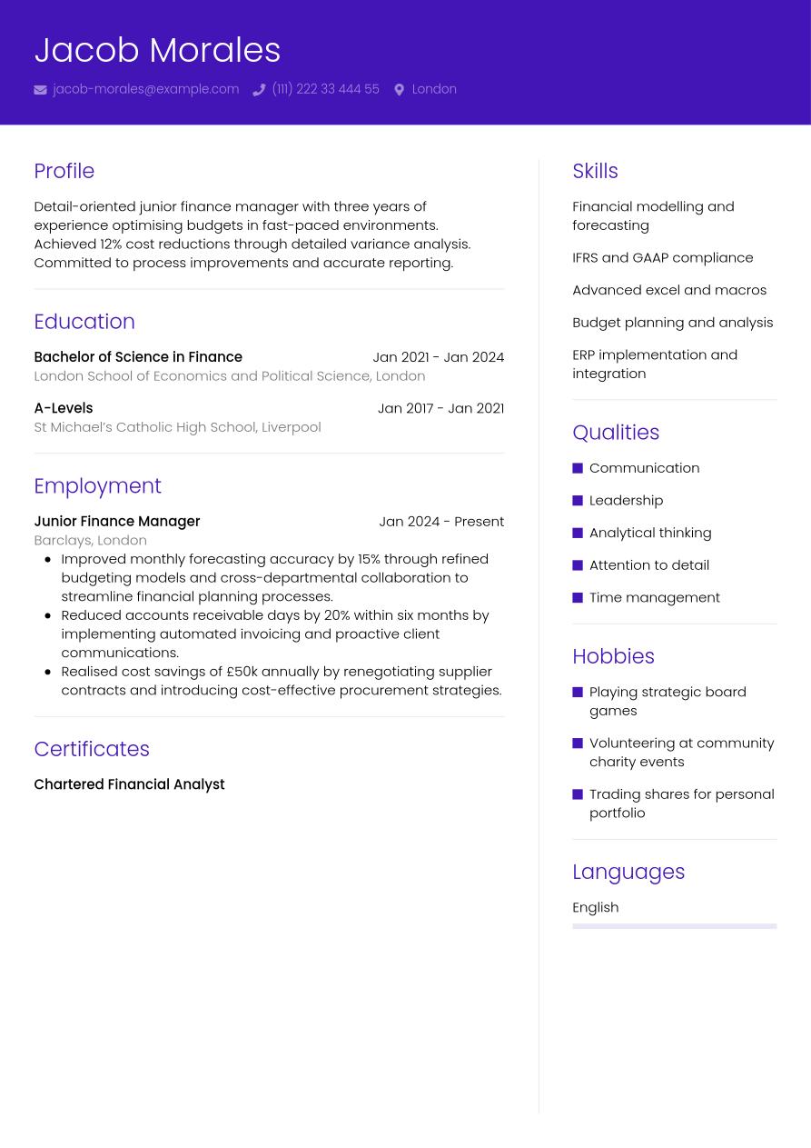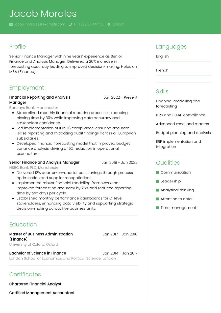 Now that you're aware of the key steps to creating a winning finance manager CV, you can review a complete example to see how a final CV looks: