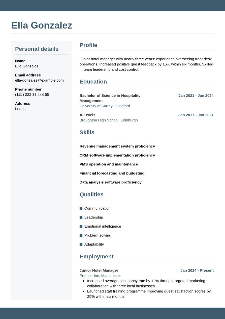 For junior or entry-level roles, employers may be more keen to know whether you have the right soft and transferable skills to adapt to the requirements of the role. In this case, place greater emphasis on soft skills for a junior hotel manager CV.