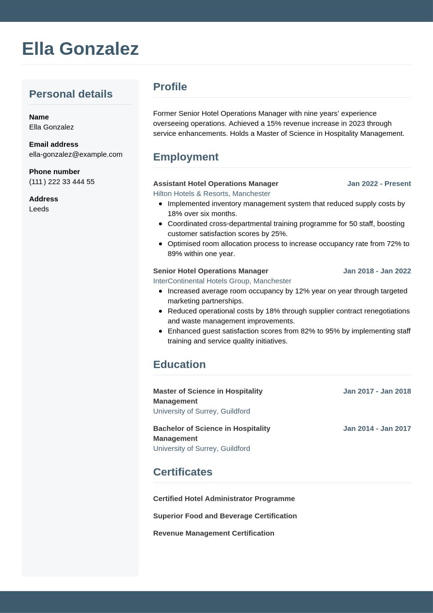 To showcase additional qualifications and training beyond the basic requirements for the role, consider adding a certifications section to your CV. It's often beneficial to include it as it can illustrate a positive attitude towards self-improvement and professional development, as well as a proactive mindset. All these qualities will appeal to most employers and decision-makers. In addition, the certifications section can be a valuable addition to your hotel manager CV if you're applying for a role that cites certain certifications or licences as a necessity in the job description. These might include roles where the use of specialist software or equipment forms part of your everyday duties.