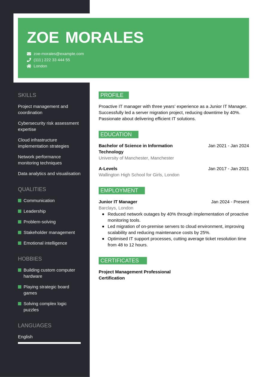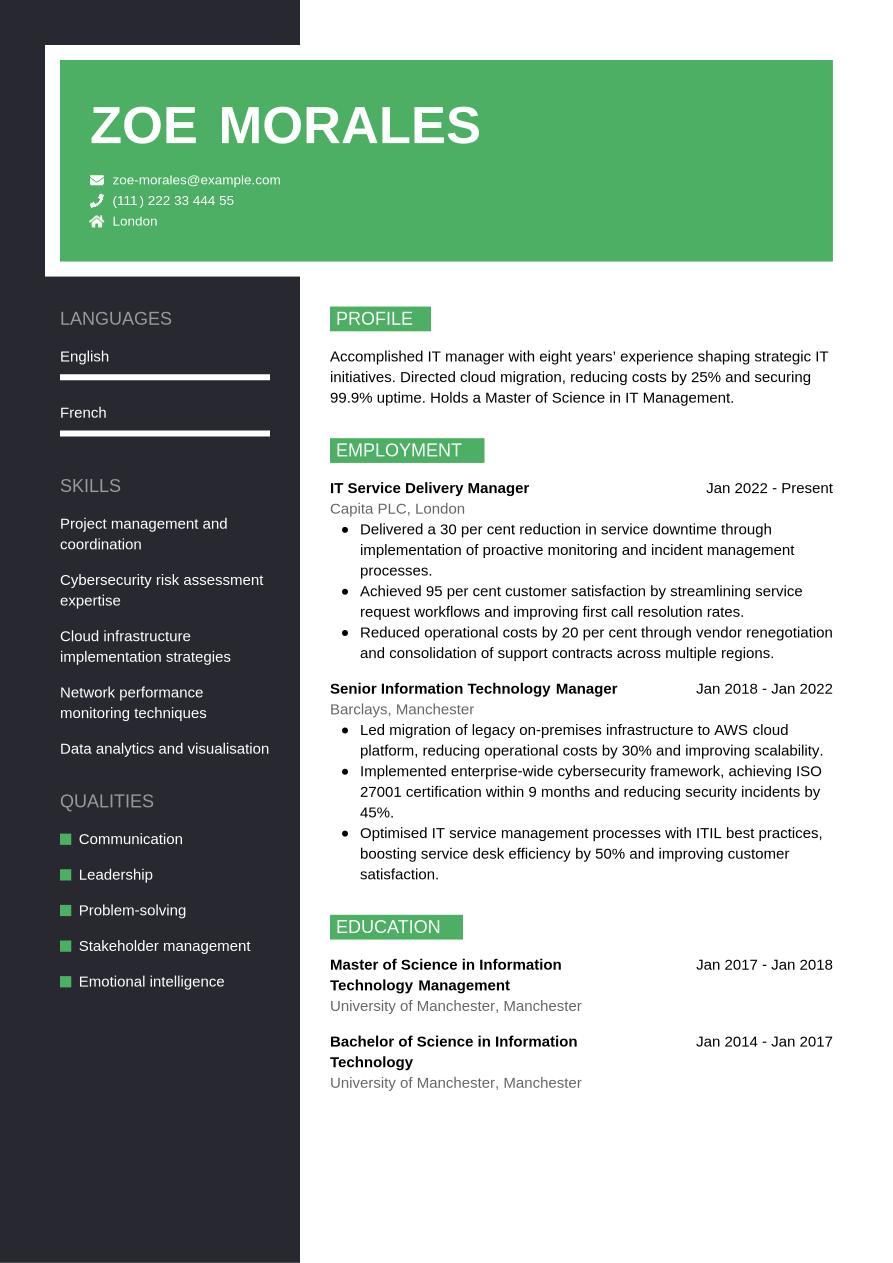 Now that we've covered the main sections to include in your IT manager CV, we can see how it would all come together in its final form in the example below: