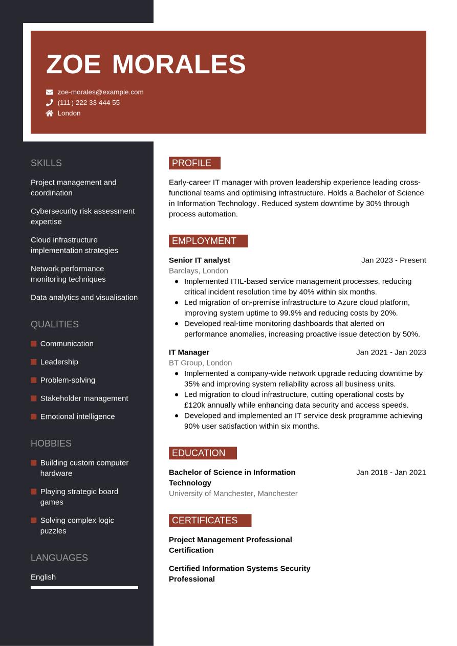 For entry-level roles, employers tend to look more for candidates with the right soft skills to show they can learn and develop on the job. As such, place extra emphasis on your soft skills for an entry-level IT manager CV.