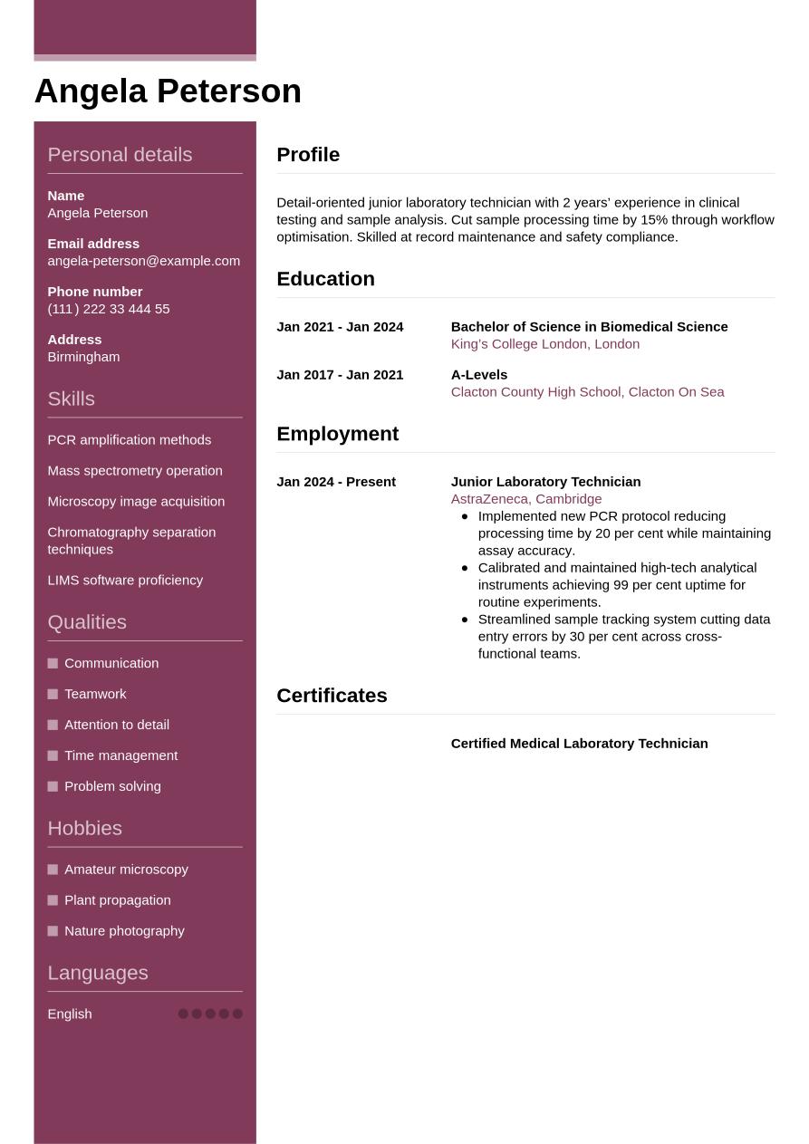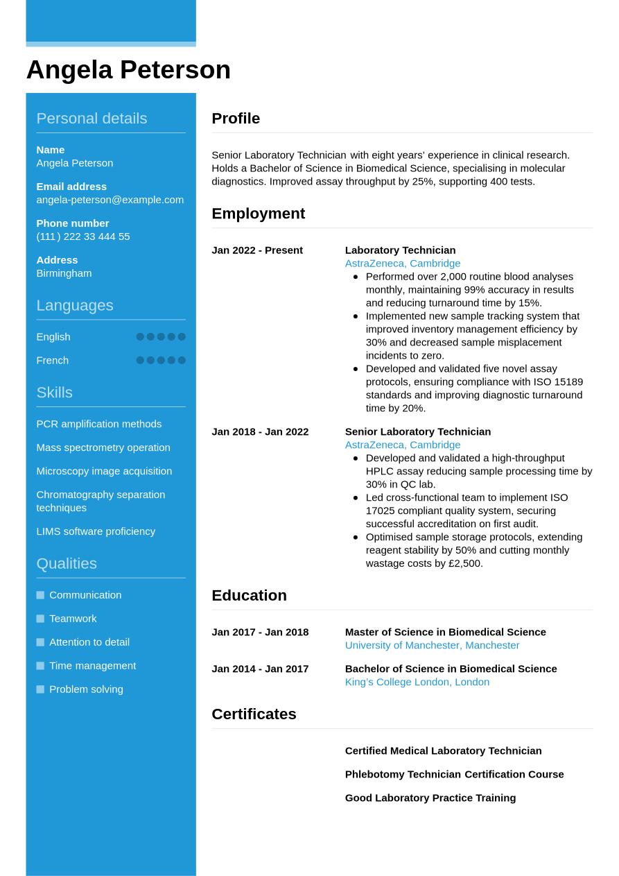 Now you know how to create a lab technician CV for maximum impact, take a look below at this full, completed example: