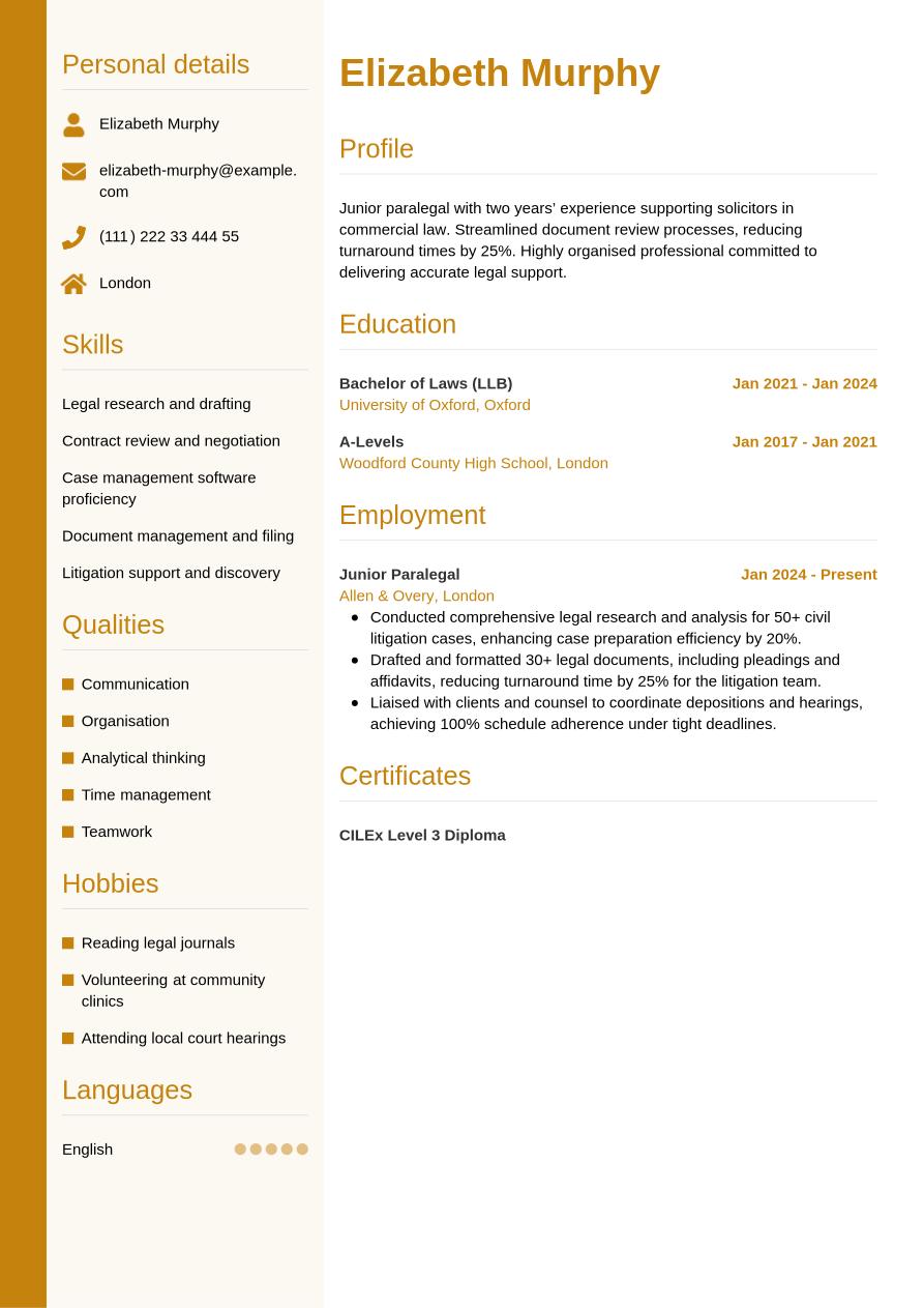 Now that you're aware of the key steps to creating a winning paralegal CV, you can review a complete example to see how a final CV looks:
