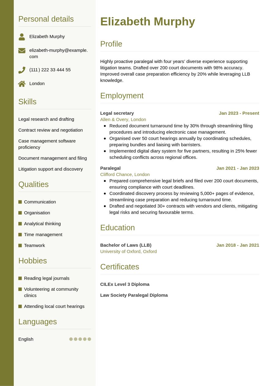 A paralegal CV that includes all the necessary details and is tailored carefully to the job description puts you in a great position. It can help you pass the ATS screening stage, make a strong impression with the employer and reach the latter stages of the recruitment process. We’ll now review the essential sections of a CV and outline how to write each for the strongest results.
