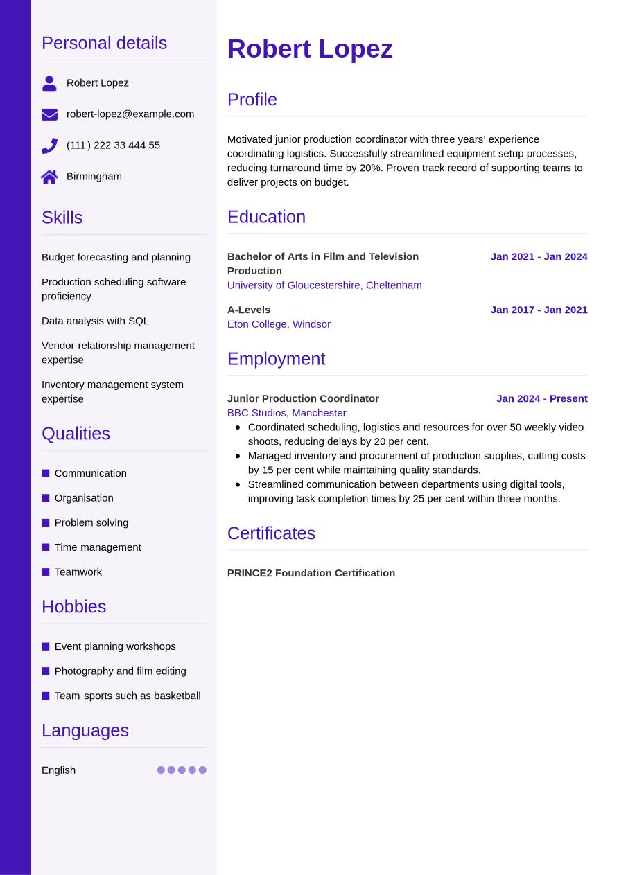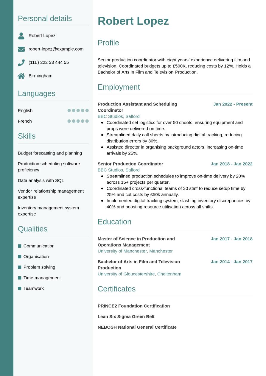 Full example of production coordinator CV