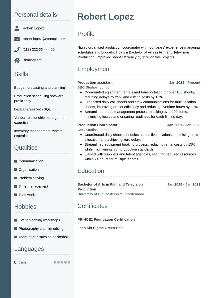 The format that gives the best chance of success for your production coordinator CV in 2026 depends on various factors, such as your experience levels, the type and level of role you're applying for and the norms of the company and industry.