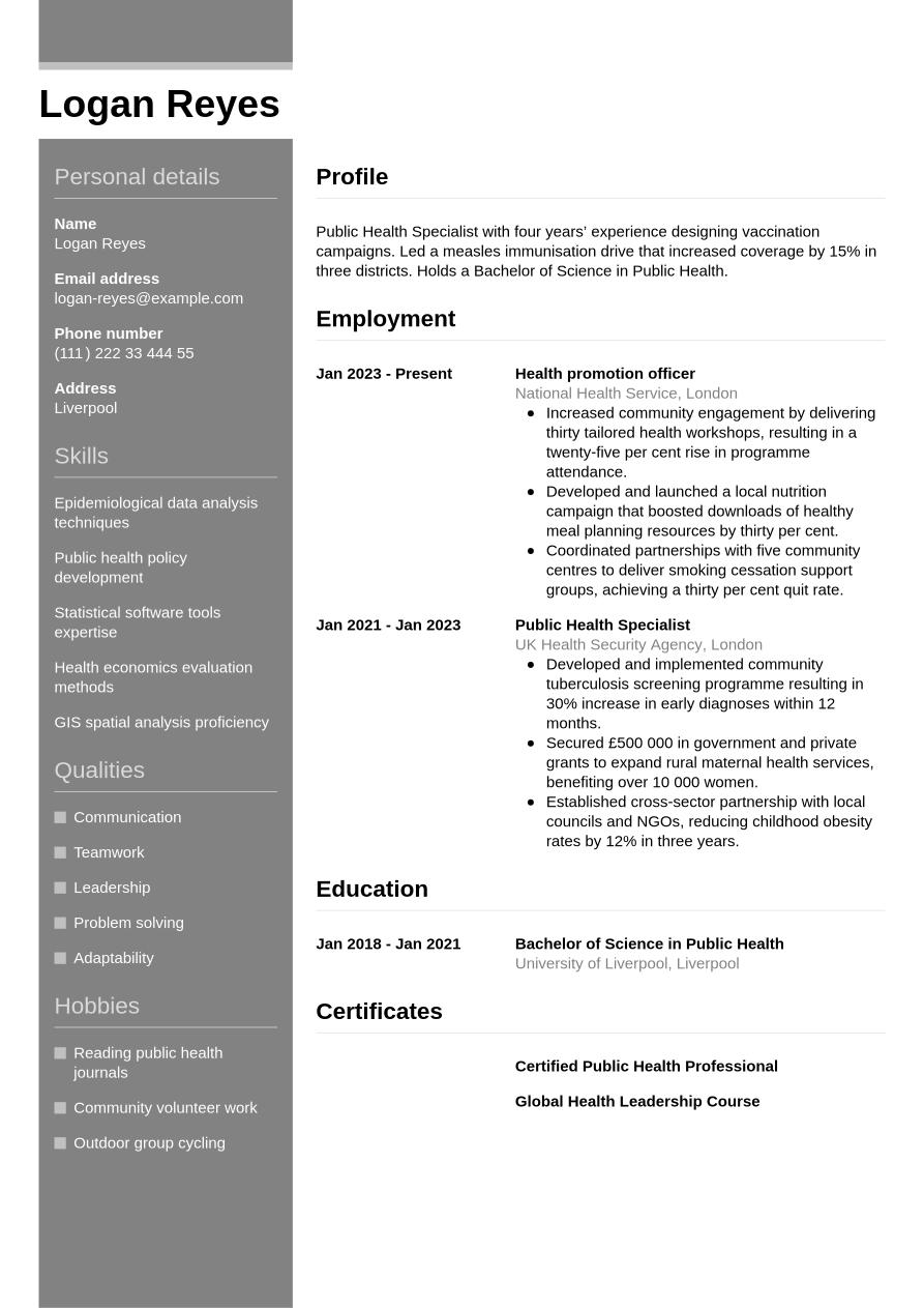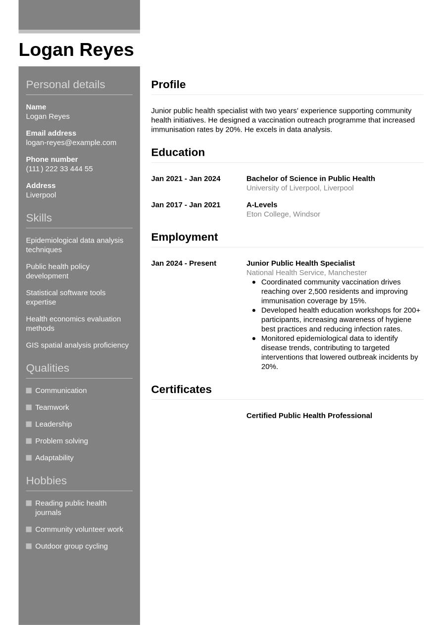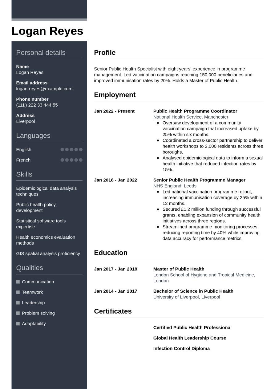 Now you know how to create a public health CV for maximum impact, take a look below at this full, completed example: