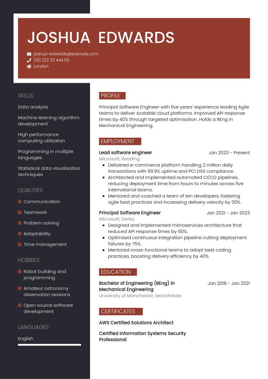 Principal Software Engineer with five years’ experience leading Agile teams to deliver scalable cloud platforms. Improved API response times by 40% through targeted optimisation. Holds a BEng in Mechanical Engineering.