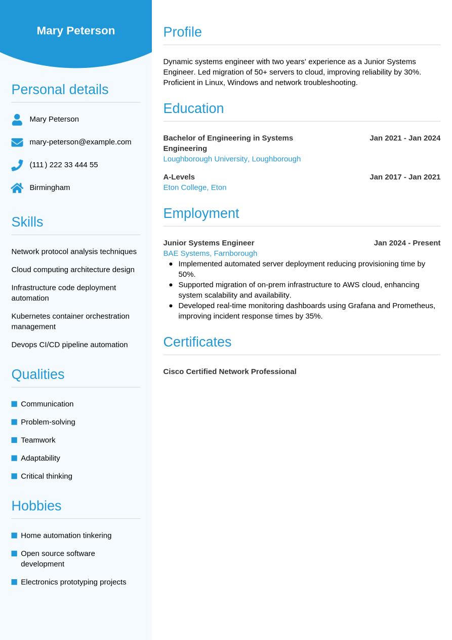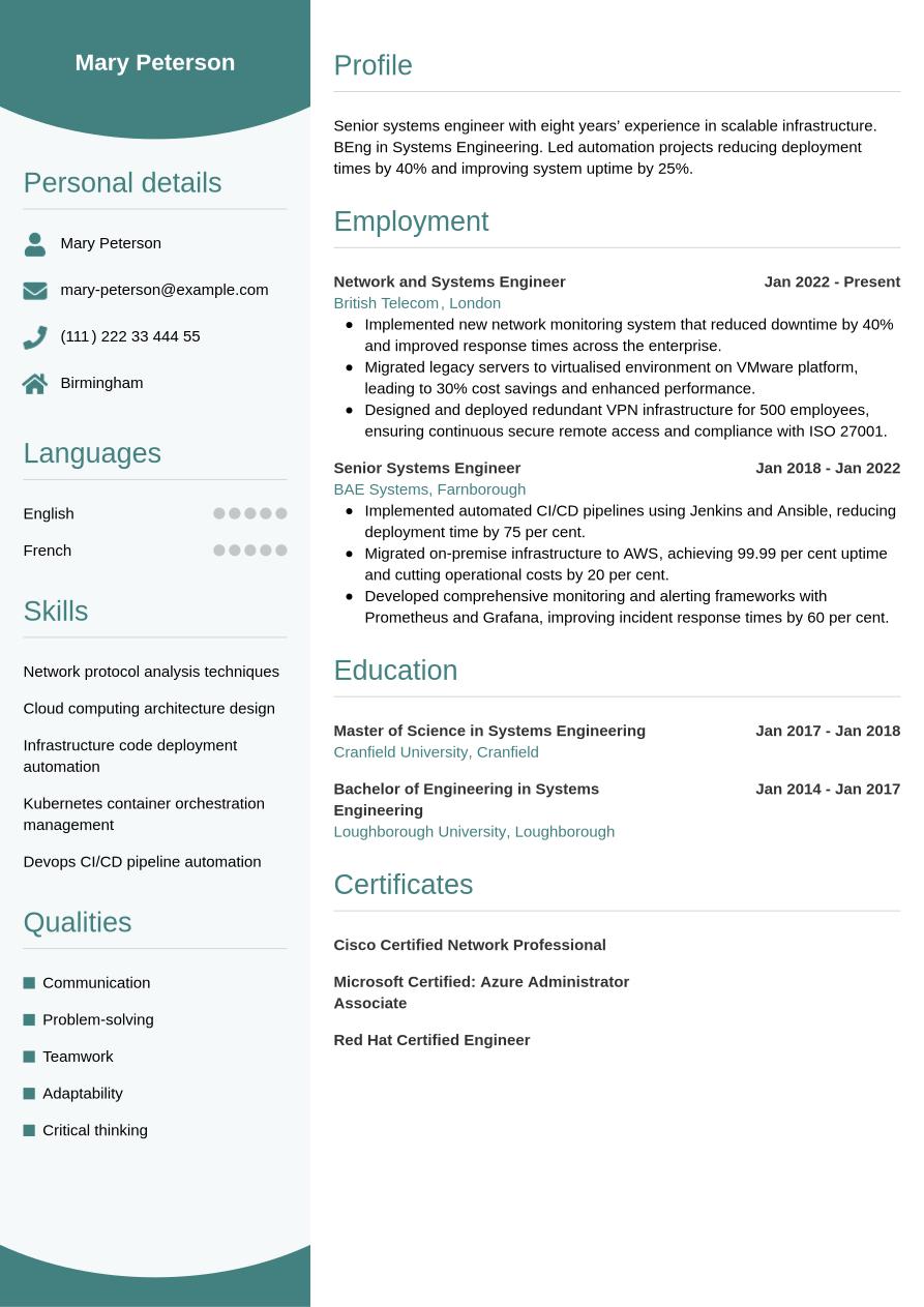 Now that we've covered the main sections to include in your systems engineer CV, we can see how it would all come together in its final form in the example below: