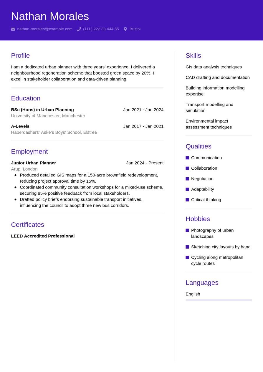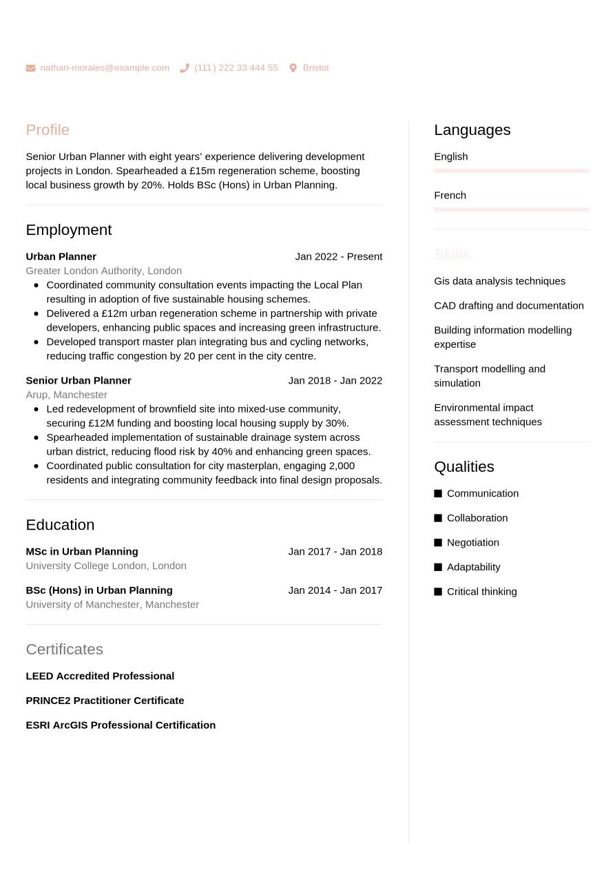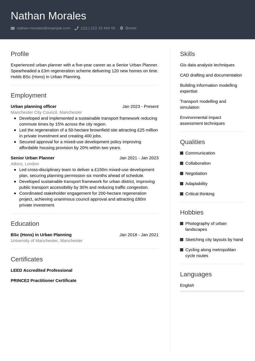 Now that you know exactly what to include in your urban planner CV, we can take a look at a final, finished example below: