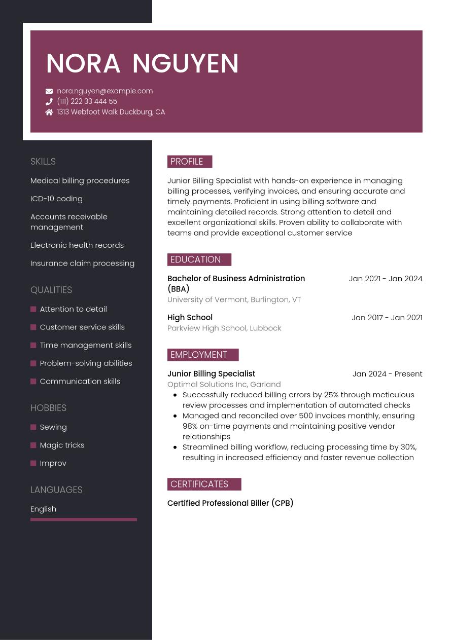If you're applying for an entry-level billing specialist role and have limited relevant experience, consider using a skills-based, or functional resume format. The layout emphasizes your skills and education above your work experience. Focus the content of your resume on your soft and transferable skills, and any hard or technical skills you've learned from your studies or career to date. You can also mention any relevant internships, training courses or voluntary roles you've taken on.
