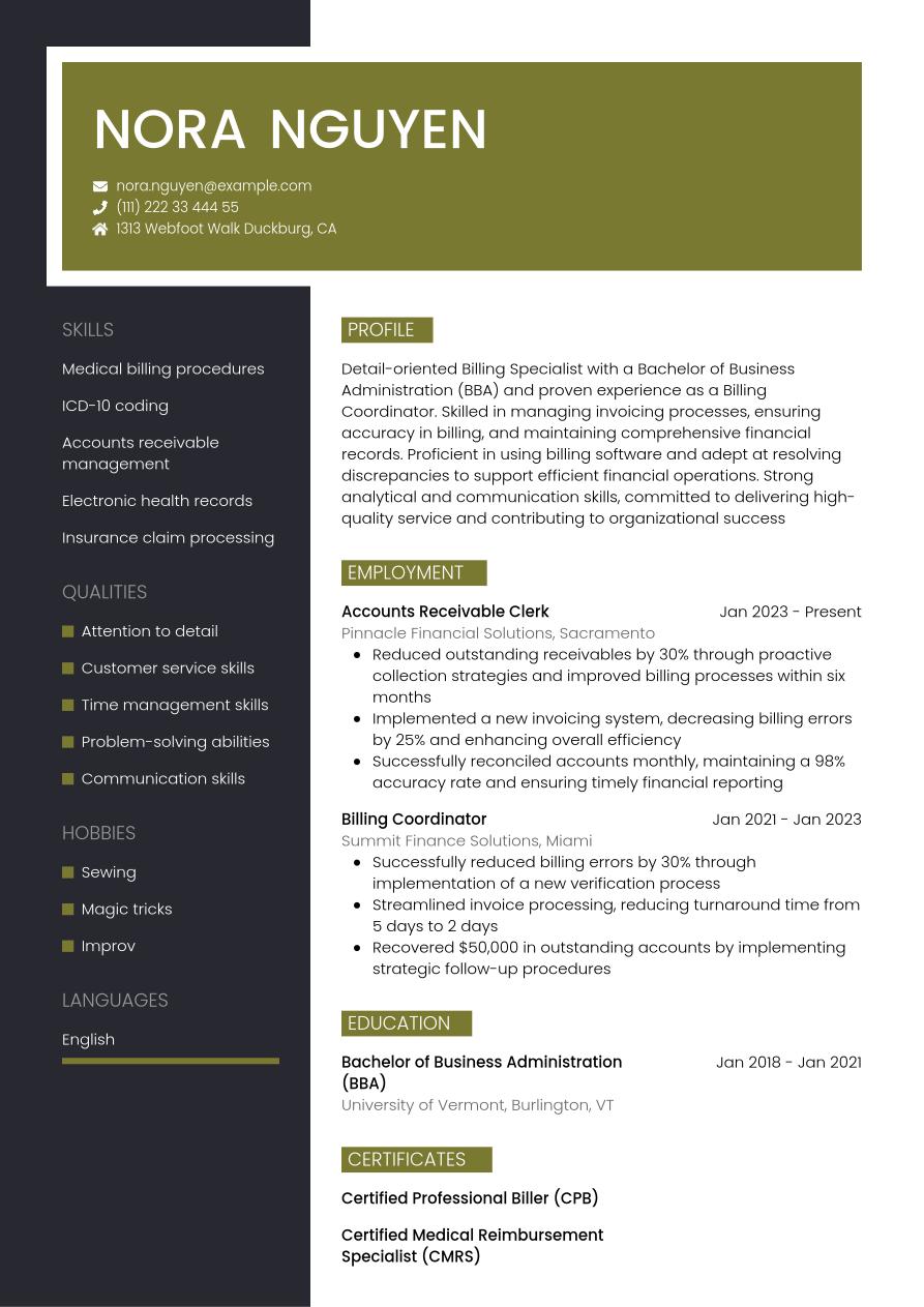 The billing specialist resume example below includes all the sections above, so you can see how a completed resume looks:
