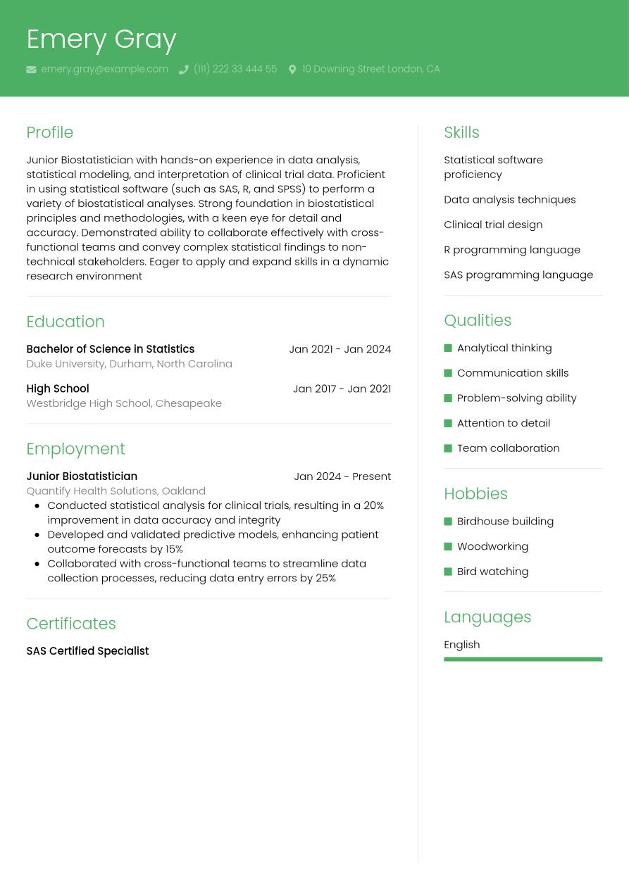 A functional or skills-based resume format might be best for applications where you have little or no relevant biostatistician experience. This layout prioritizes your skills and education sections above your work experience. Soft and transferable skills are often more highly valued by employers for junior roles, so highlight these. Also add any internships, volunteer work or training courses you've undertaken.