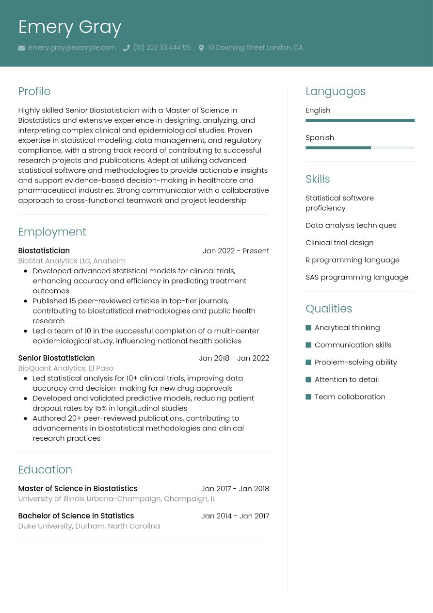 - Don't use jargon or acronyms that can make your biostatistician resume more difficult to read.