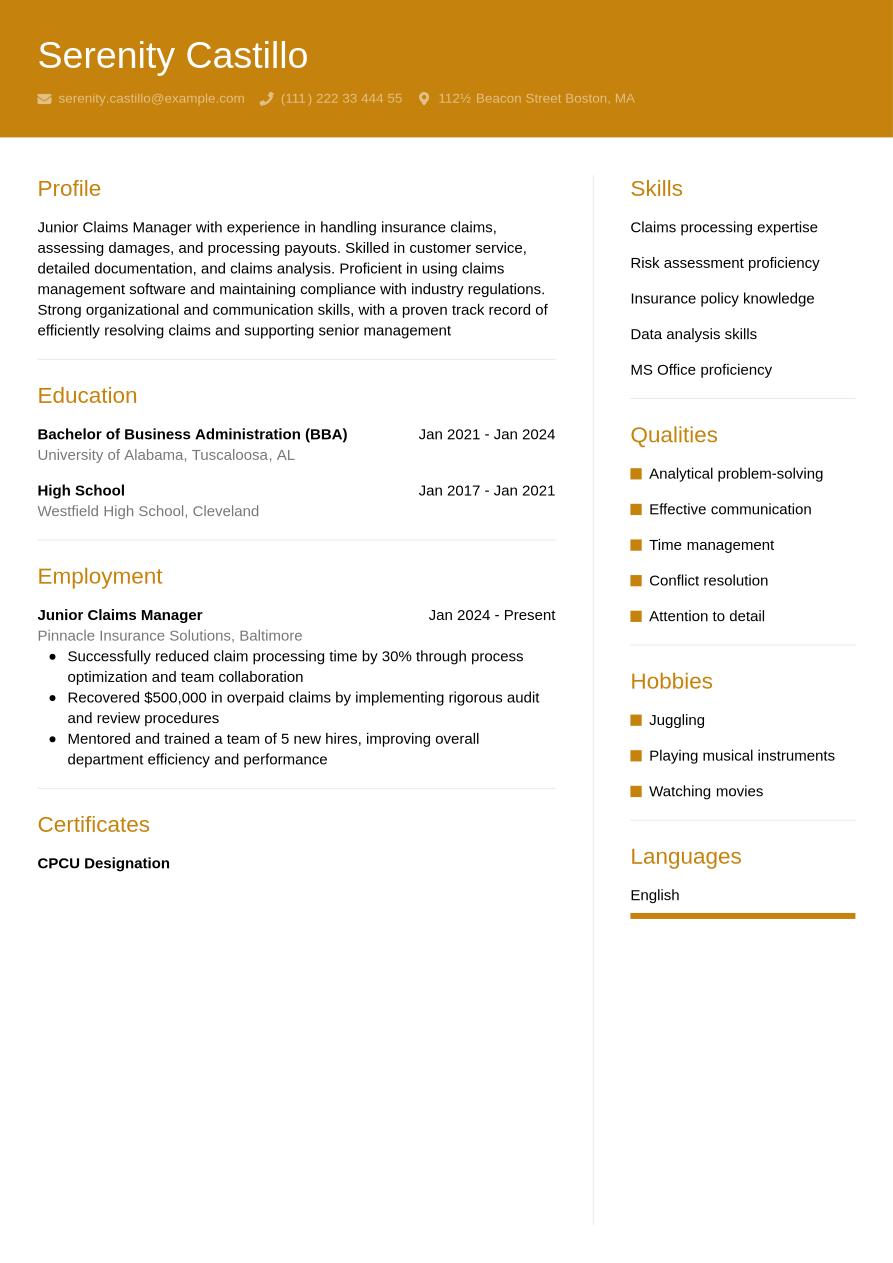 Starting a career as a claims manager gives you the chance to gain experience in reviewing insurance claims and ensuring compliance standards. If you want to stand out with your claims manager applications, you'll need to create a professional resume that makes a strong impression on employers. In this article, we'll explain how to write a winning resume for claims manager applications that best showcases your skills and experience.