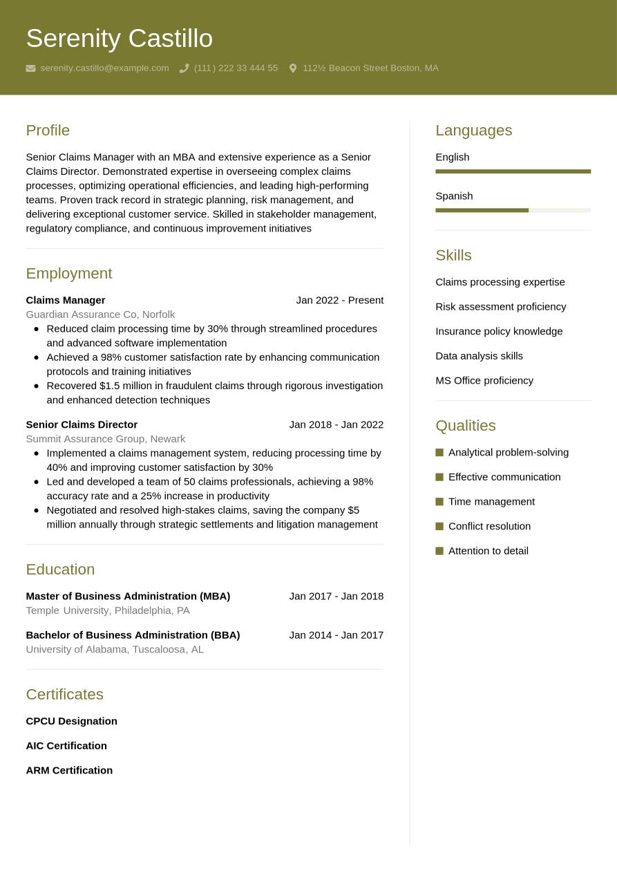 As a highly experienced candidate, you'll want your claims manager resume to showcase your depth of relevant work experience, as well as other achievements. Use a reverse-chronological format and add additional sections to prove you're a strong candidate. Senior resumes are often longer than resumes for junior roles. This is because you may choose to include extra sections, such as awards, professional memberships, publications, conferences or certifications on your resume.