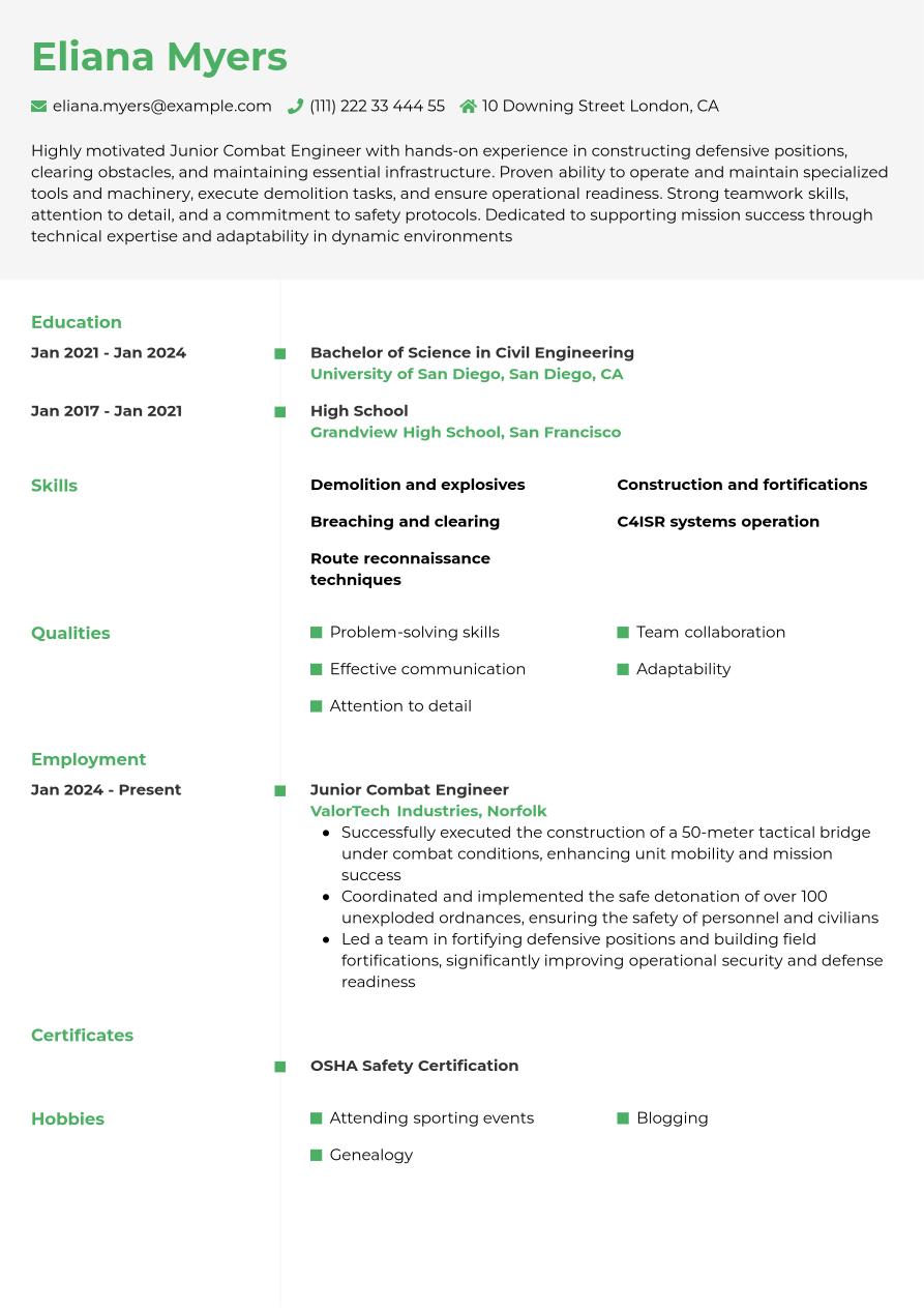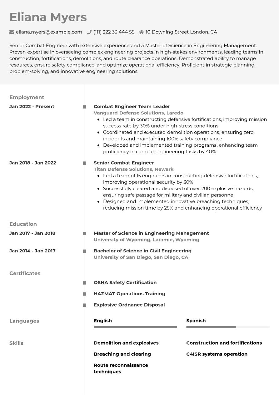 Now we've covered the main sections to include in your combat engineer resume, let's take a look at how it all comes together in the example below: