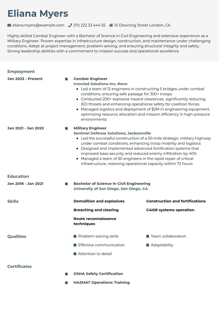 A career as a combat engineer typically involves constructing defensive structures and operating heavy machinery. A professional resume for combat engineer applications will showcase your relevant skills and career achievements, to help you stand out from the crowd. In this article, we'll outline how to write a winning resume to boost your chances of success in your combat engineer applications.