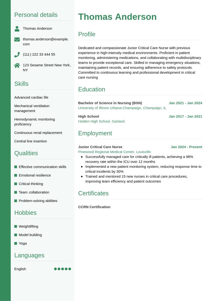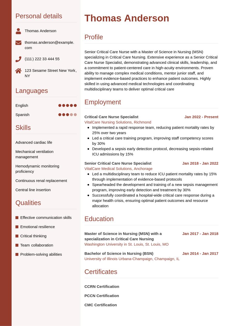 The critical care nurse resume example below incorporates all the information from above into a full-designed resume template, so you can see how a final resume will look: