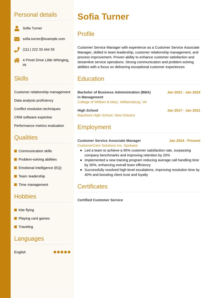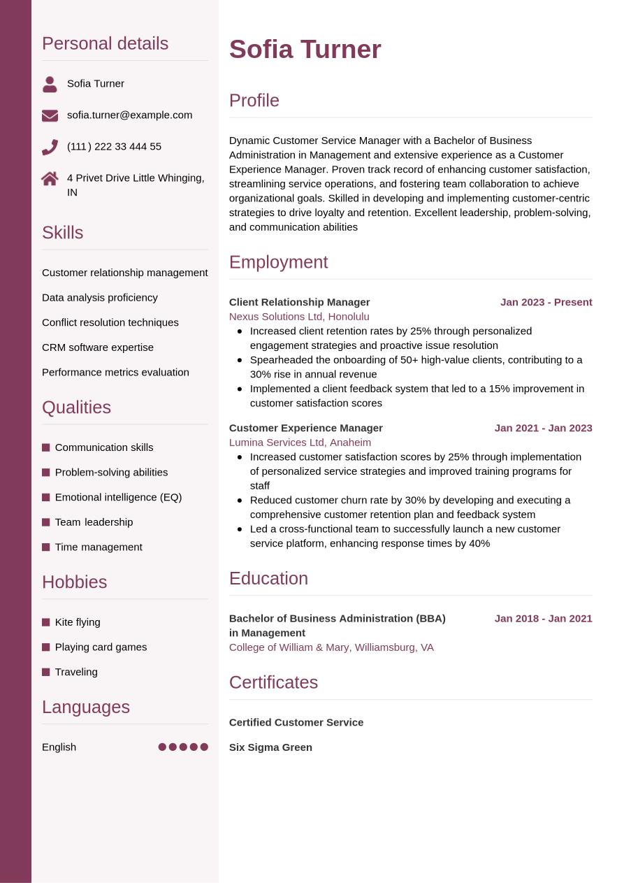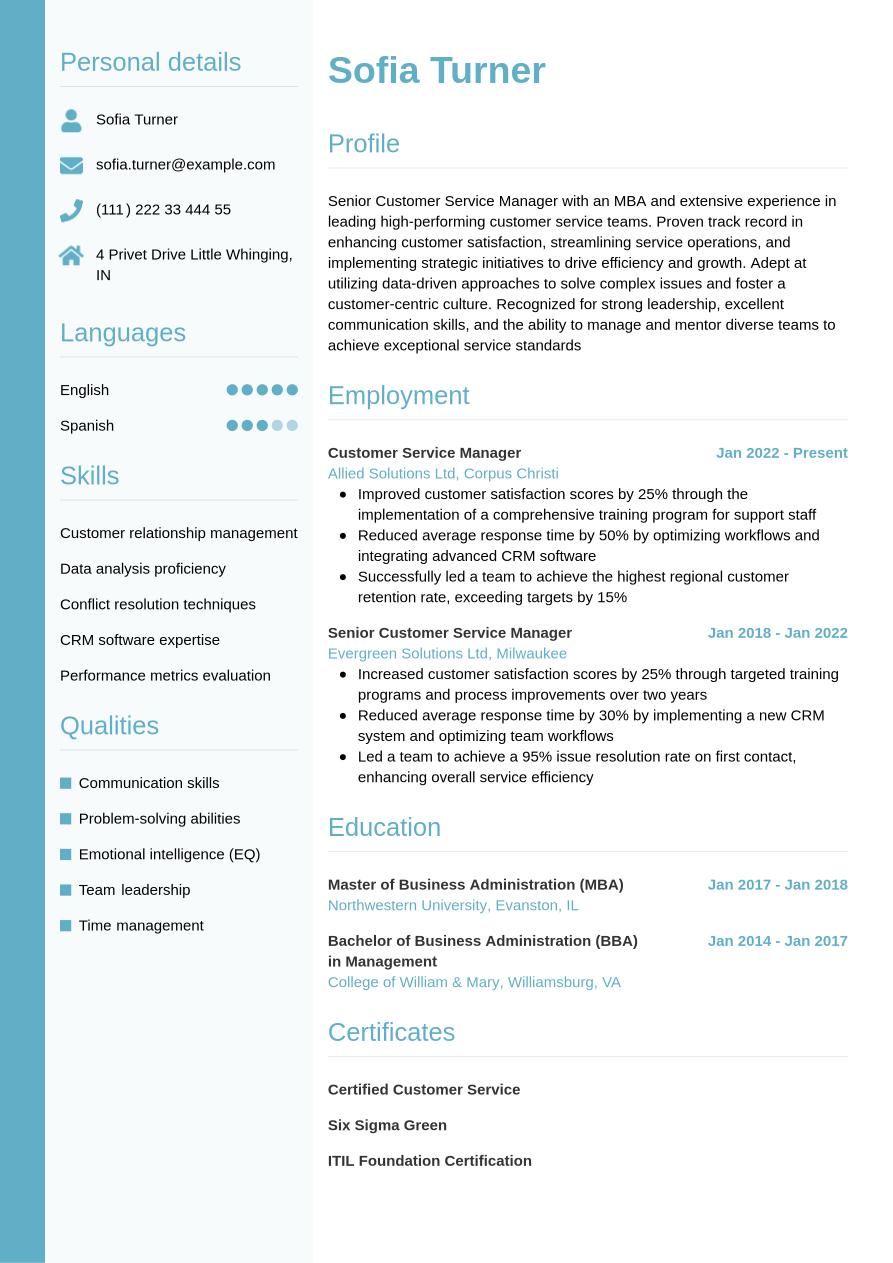 Now we've covered the main sections to include in your customer service manager resume, let's take a look at how it all comes together in the example below: