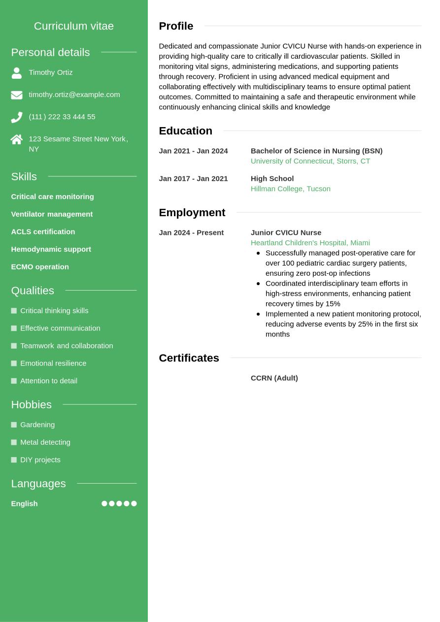 If you have no work experience as a CVICU nurse or have just started in the industry, you could consider using a functional or skills-based format, which emphasizes your skills and education. Soft and transferable skills are often more highly valued by employers for junior roles, so highlight these. Also add any internships, volunteer work or training courses you've undertaken.