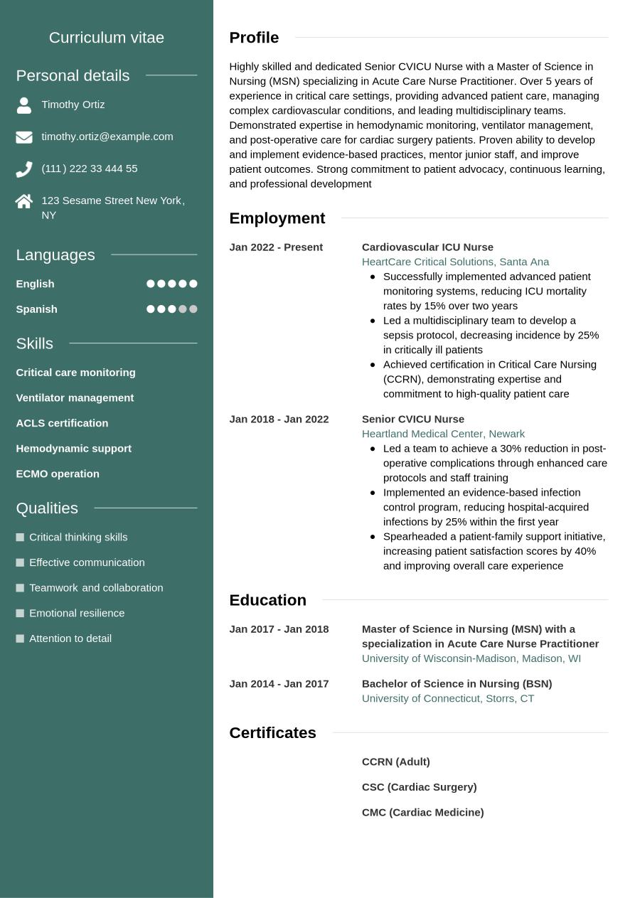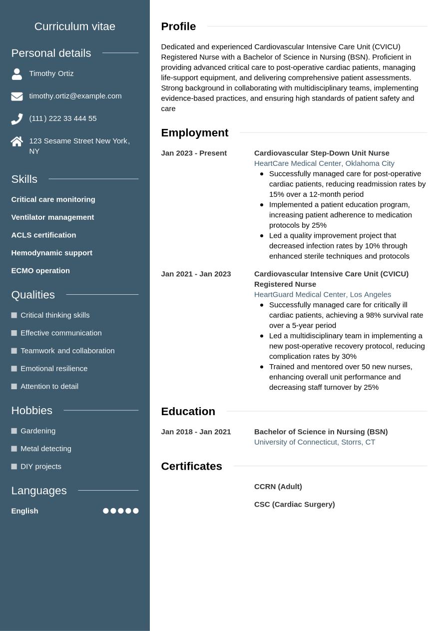 Although the content of a CVICU nurse resume may differ according to your experience and seniority, the main sections will remain the same.