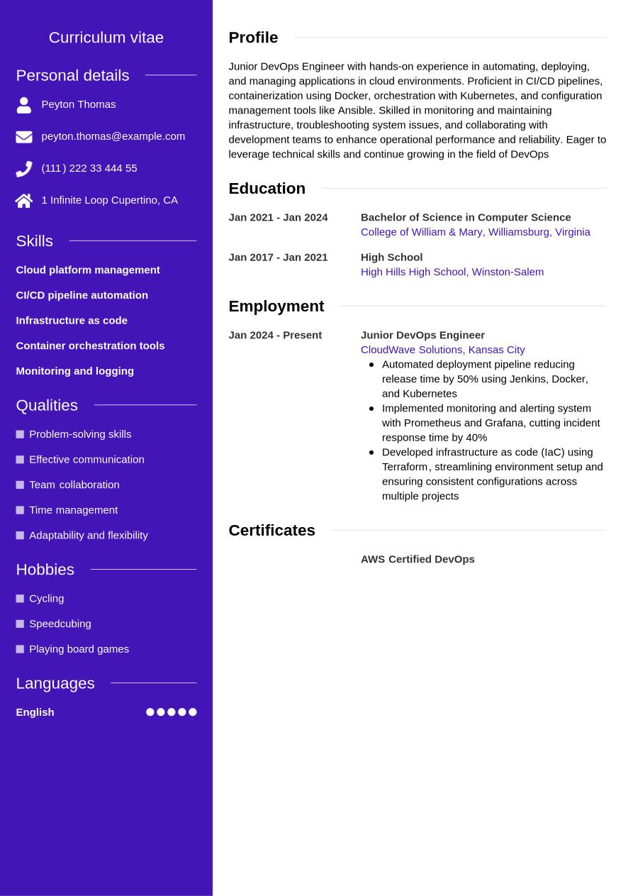 The DevOps resume example below includes all the sections above, so you can see how a completed resume looks: