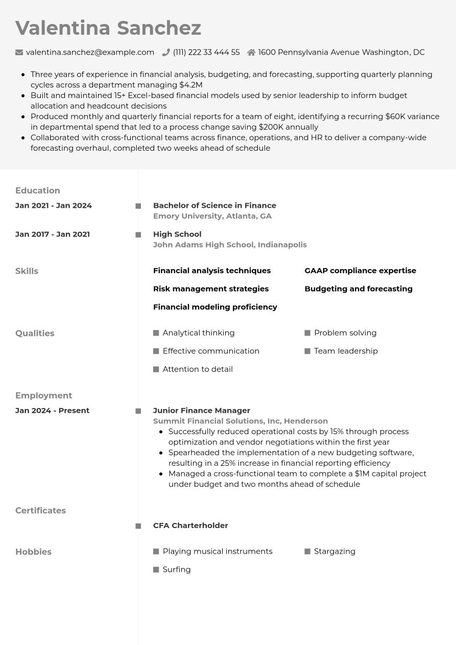 If you're applying for junior, entry-level or graduate finance manager positions and you lack work experience, consider using a skills-based resume format to emphasize your skills and education. Furthermore, a junior resume is more likely to focus on soft and transferable skills, as well as relevant training, internships and volunteer roles.
