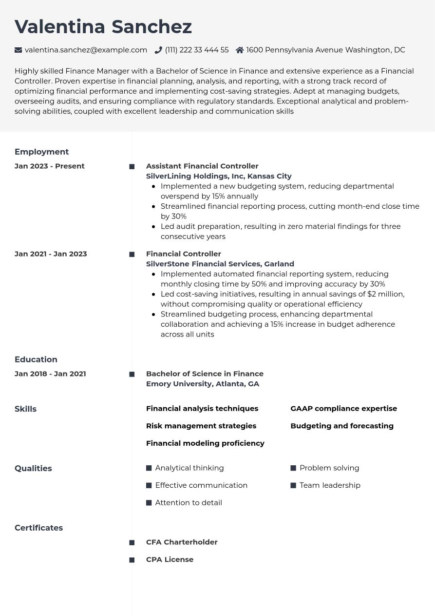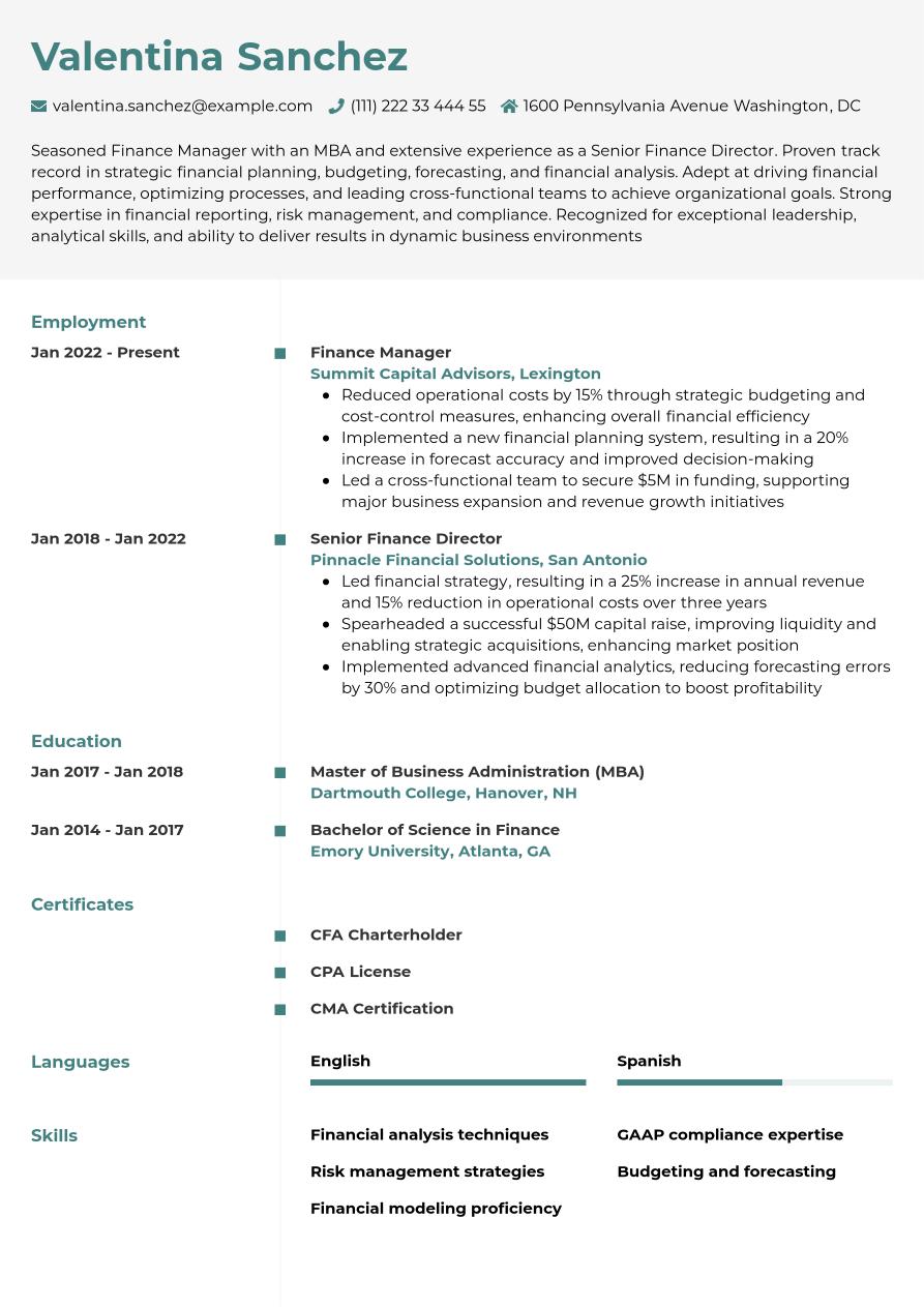 Finance Manager Resume Example