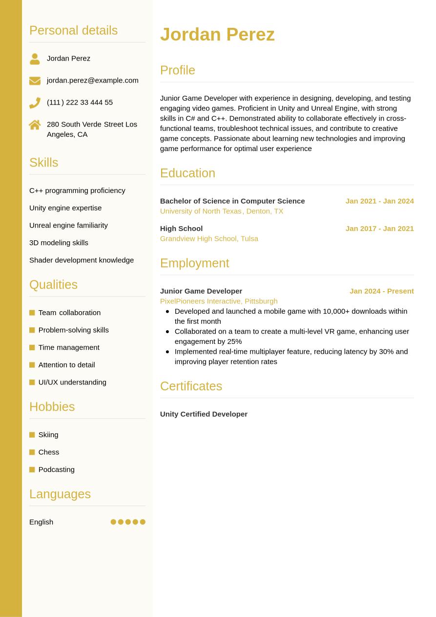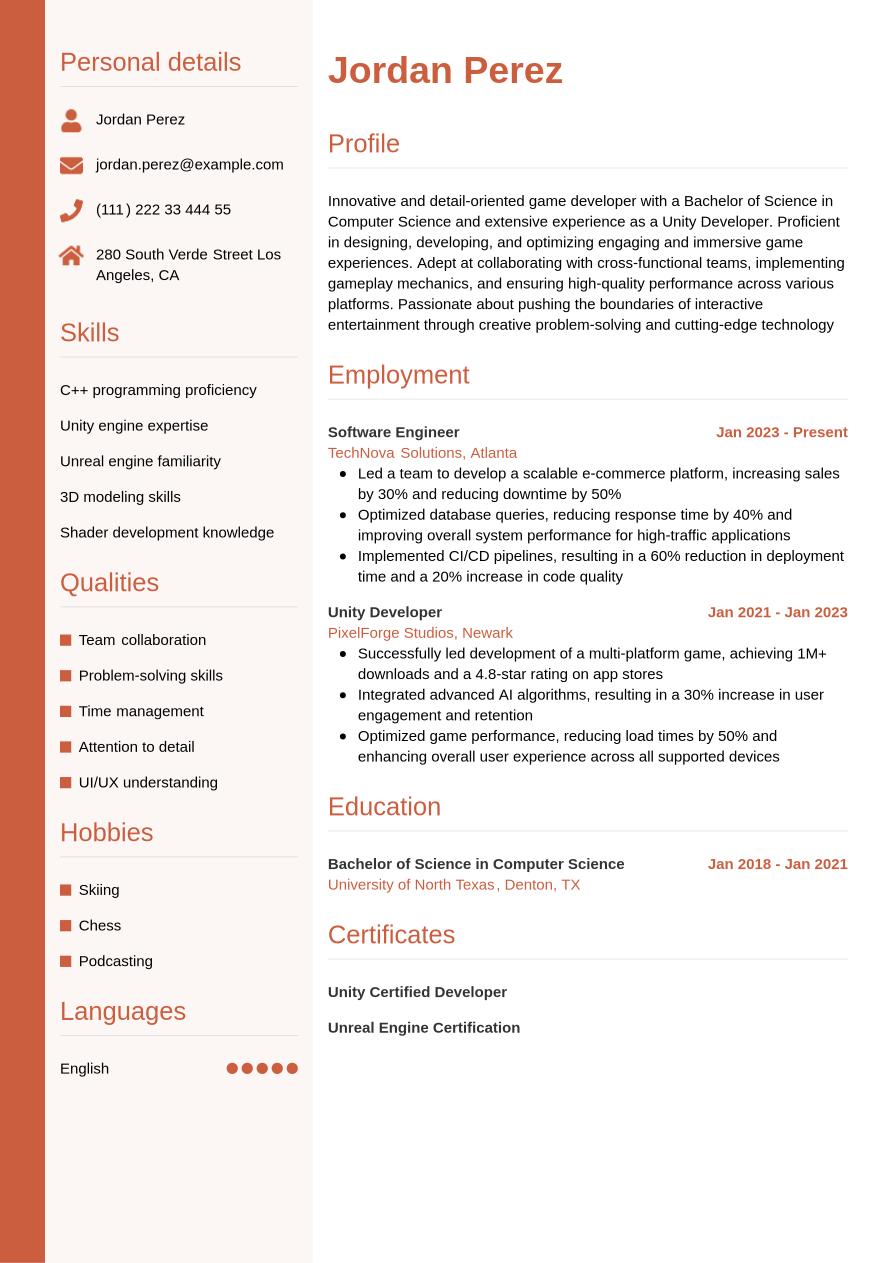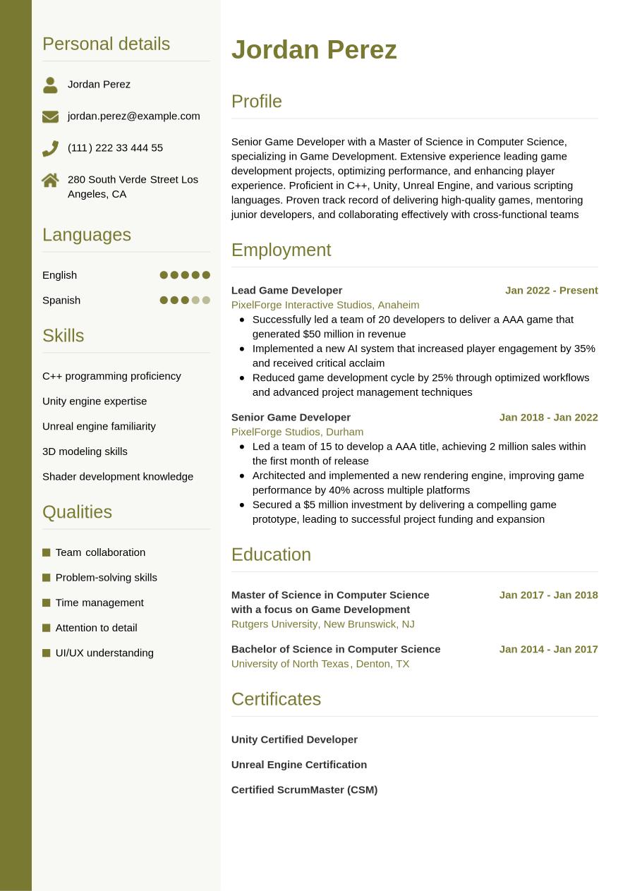 Now we've covered the main sections to include in your game developer resume, let's take a look at how it all comes together in the example below: