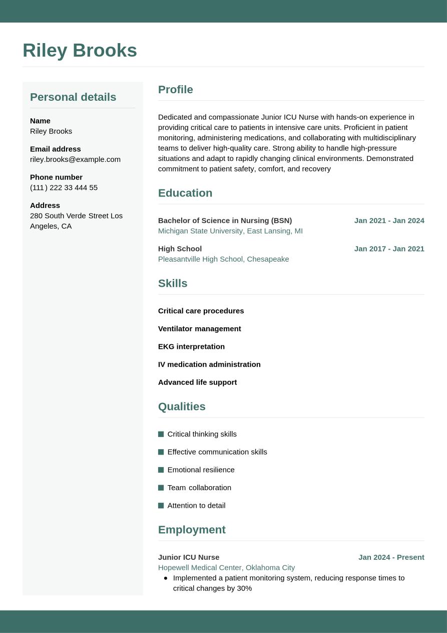 If you're applying for junior, entry-level or graduate ICU nurse positions and you lack work experience, consider using a skills-based resume format to emphasize your skills and education. Likewise, an entry-level resume might focus more on soft and transferable skills, as well as details about internships, voluntary work or relevant training you've completed.