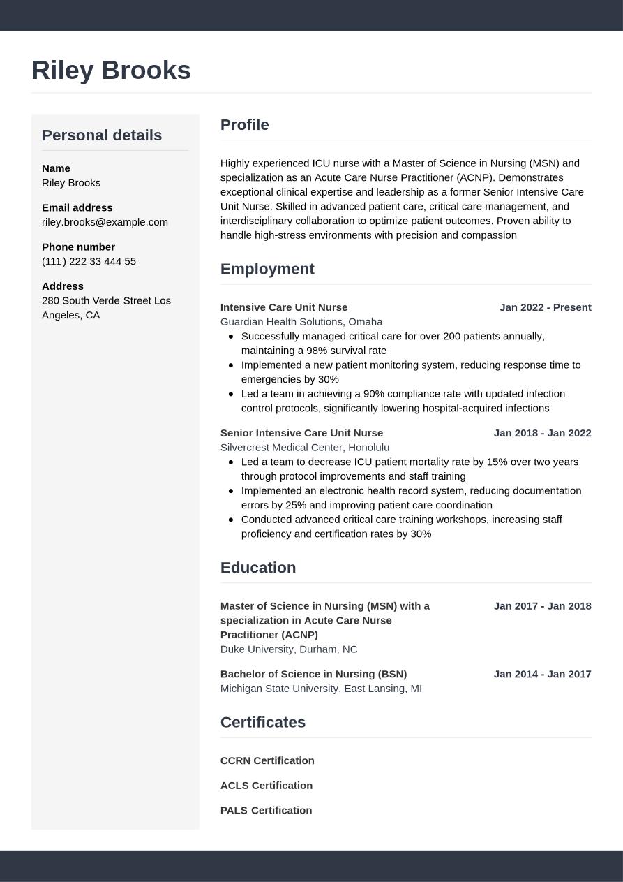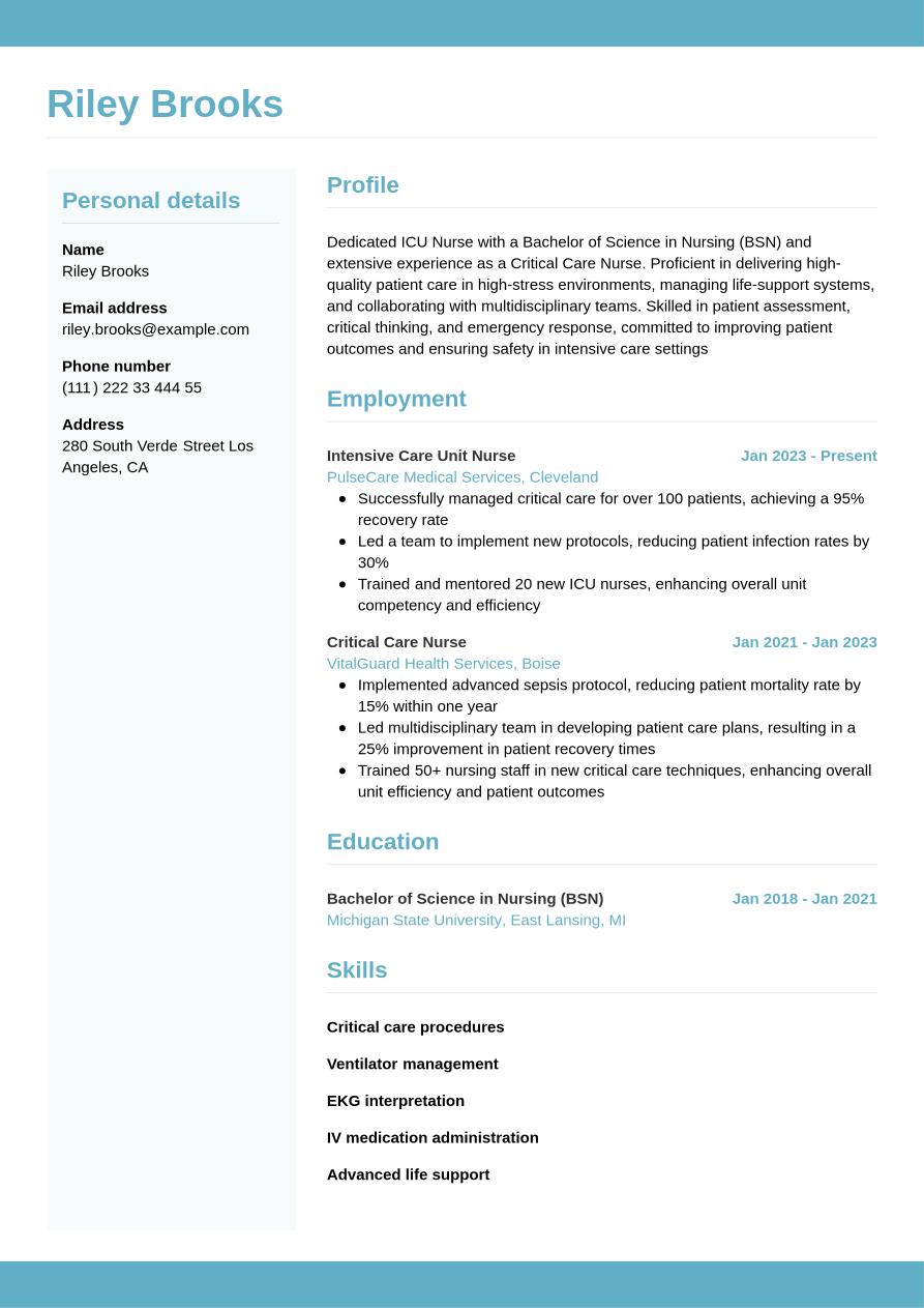 Now we've covered the main sections to include in your ICU nurse resume, let's take a look at how it all comes together in the example below: