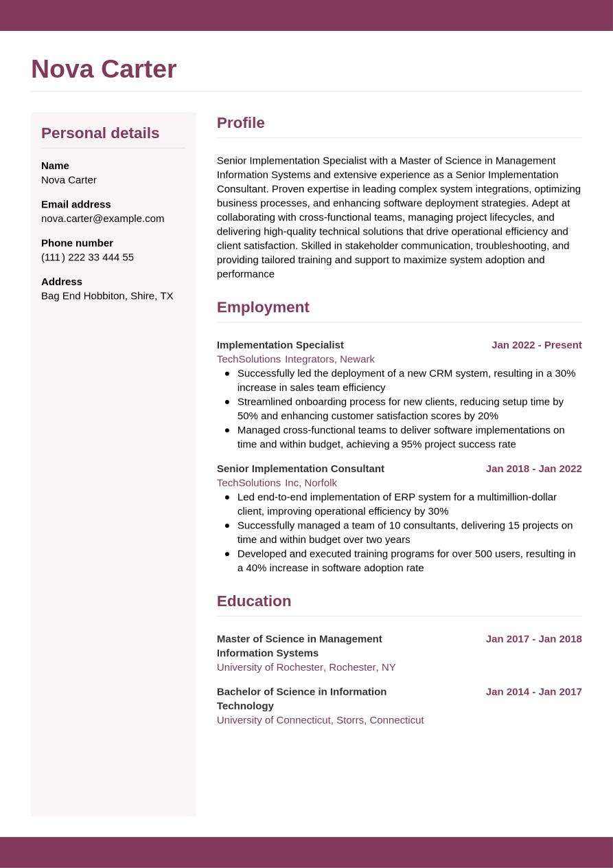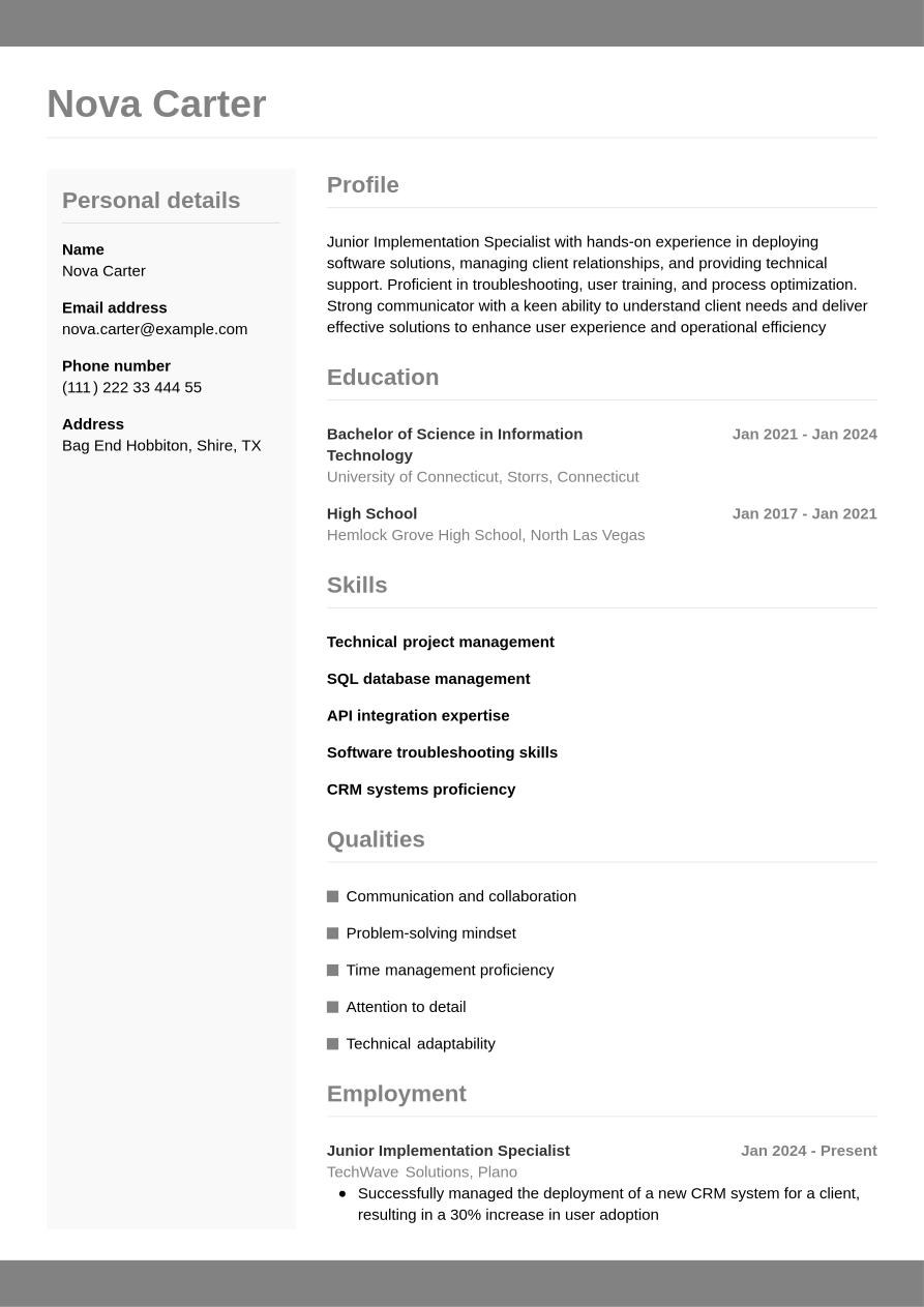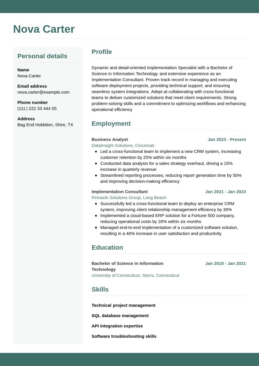 The implementation specialist resume example below includes all the sections above, so you can see how a completed resume looks: