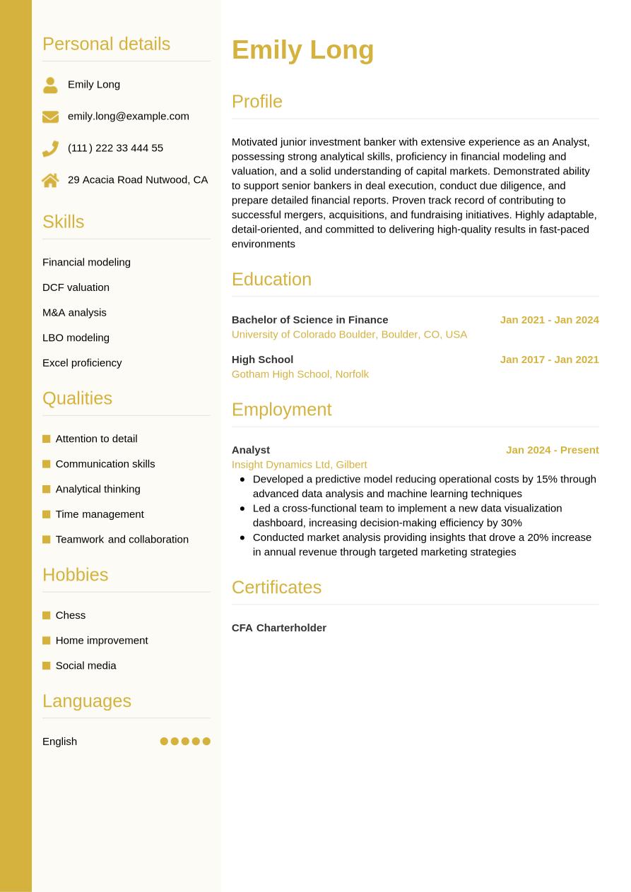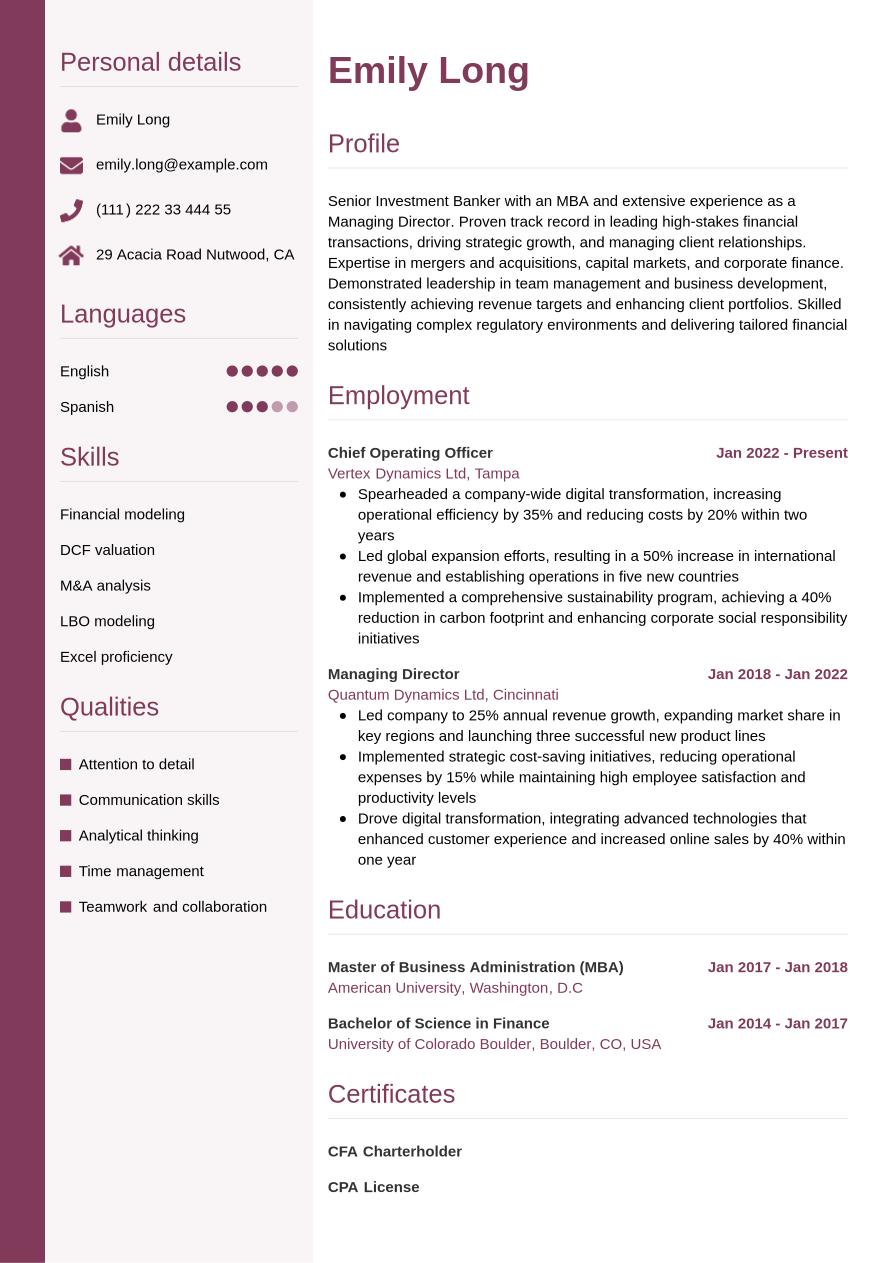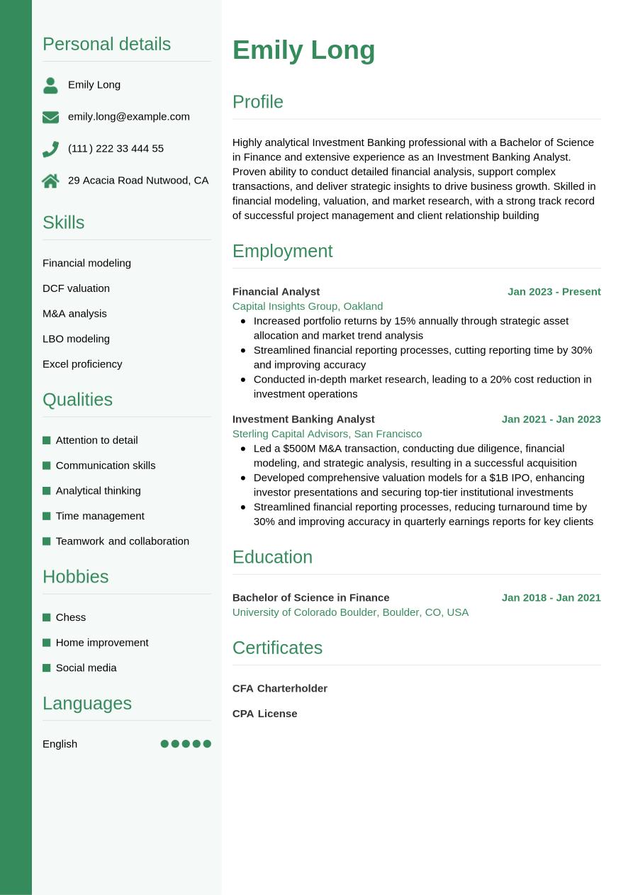 The investment banking resume example below incorporates all the information from above into a full-designed resume template, so you can see how a final resume will look: