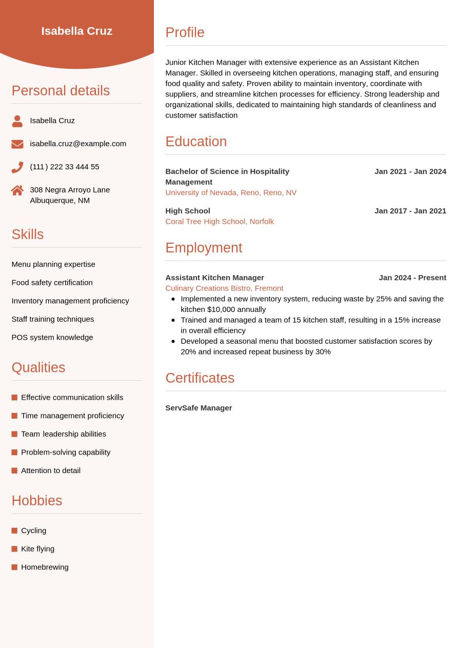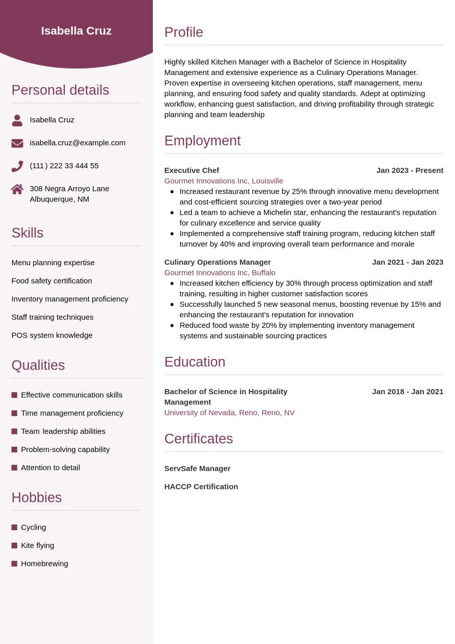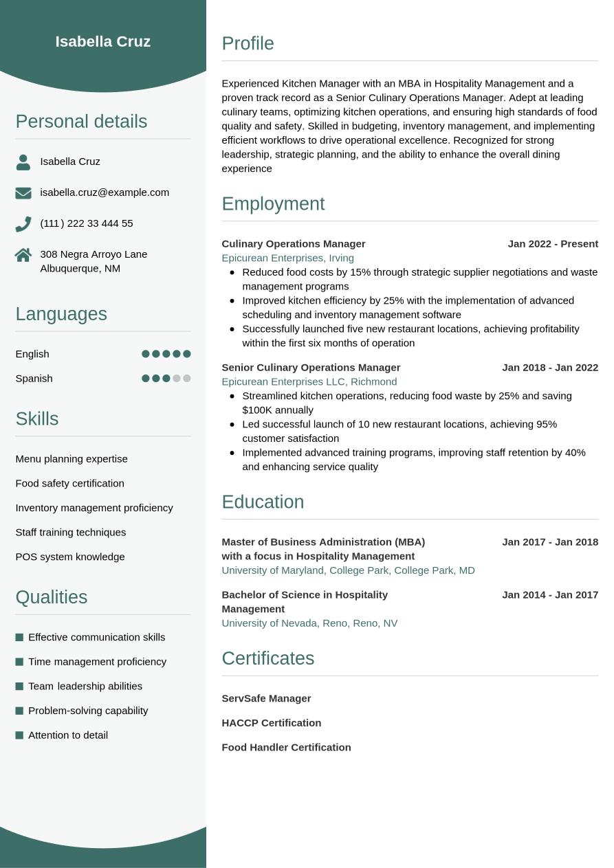 The kitchen manager resume example below includes all the sections above, so you can see how a completed resume looks:
