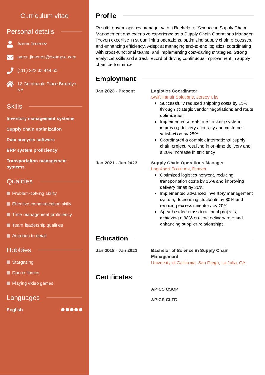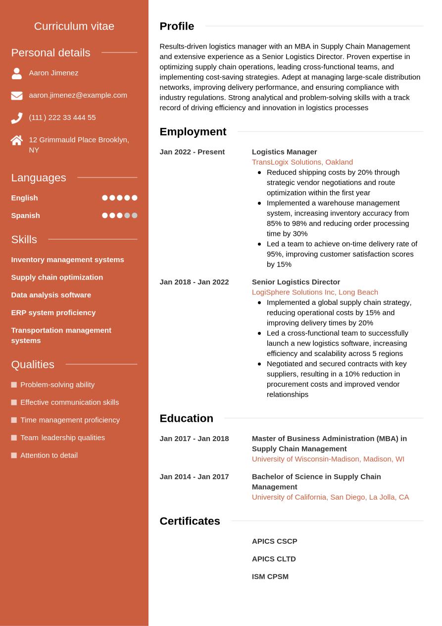 The logistics manager resume example below includes all the sections above, so you can see how a completed resume looks: