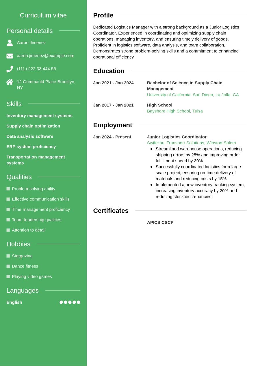 Results-driven logistics manager with a Bachelor of Science in Supply Chain Management and extensive experience as a Supply Chain Manager. Proven expertise in optimizing supply chain processes, reducing costs, and improving operational efficiency. Demonstrates strong leadership skills, strategic planning, and the ability to drive continuous improvement initiatives. Skilled in inventory management, vendor relations, and logistics coordination, with a track record of achieving on-time delivery and high customer satisfaction