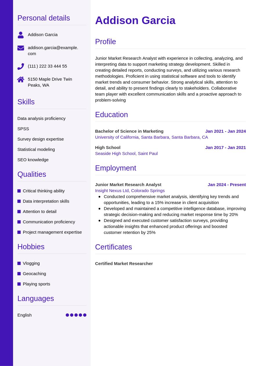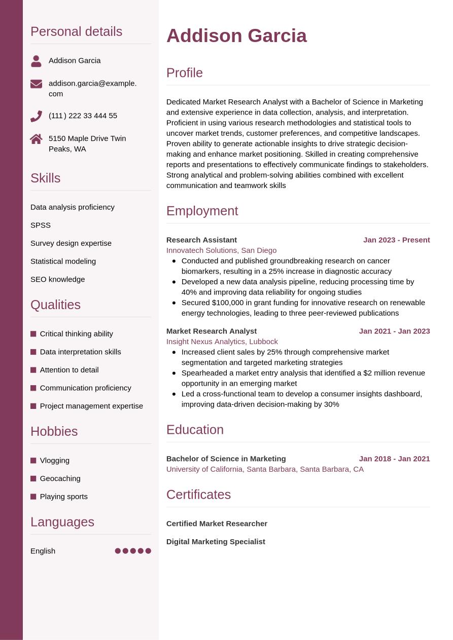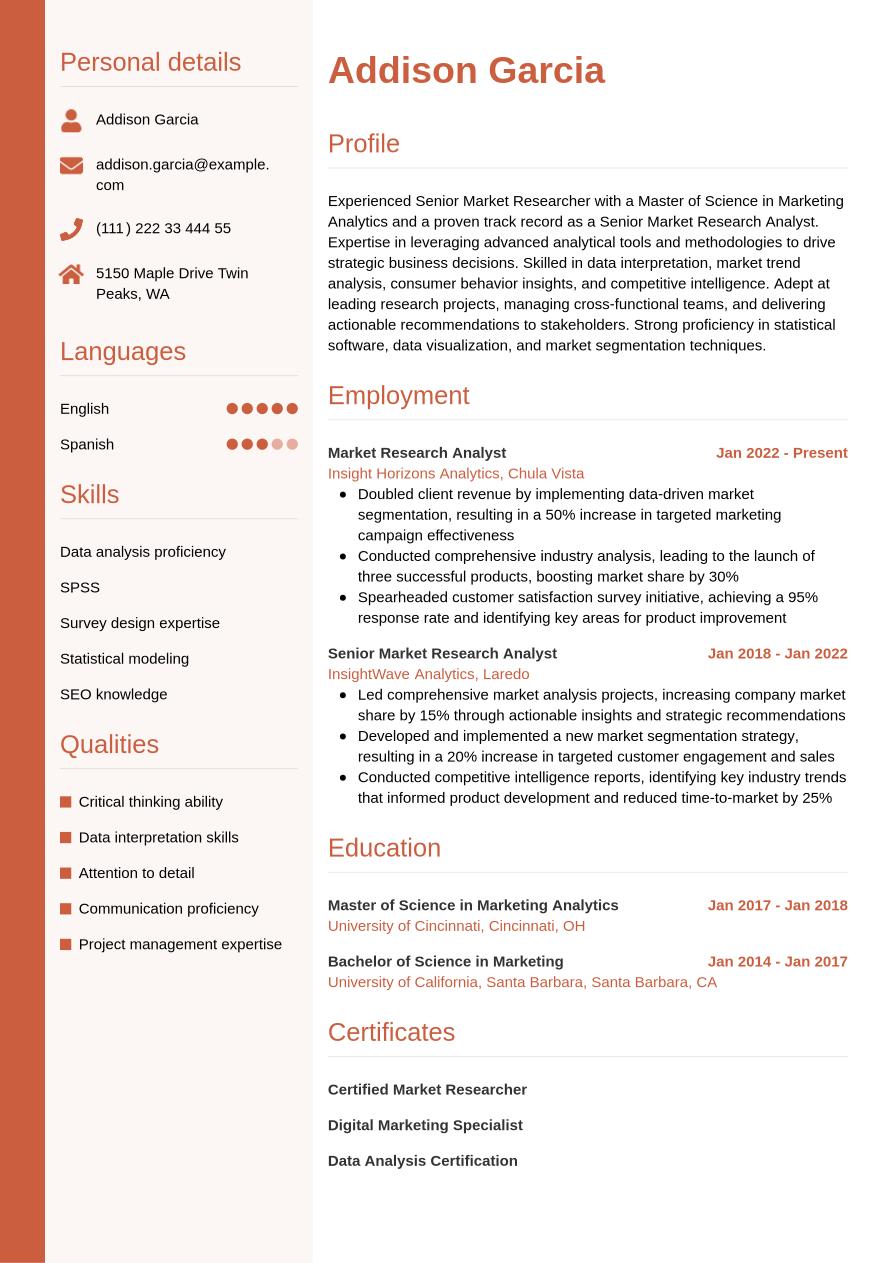 The market research resume example below includes all the sections above, so you can see how a completed resume looks: