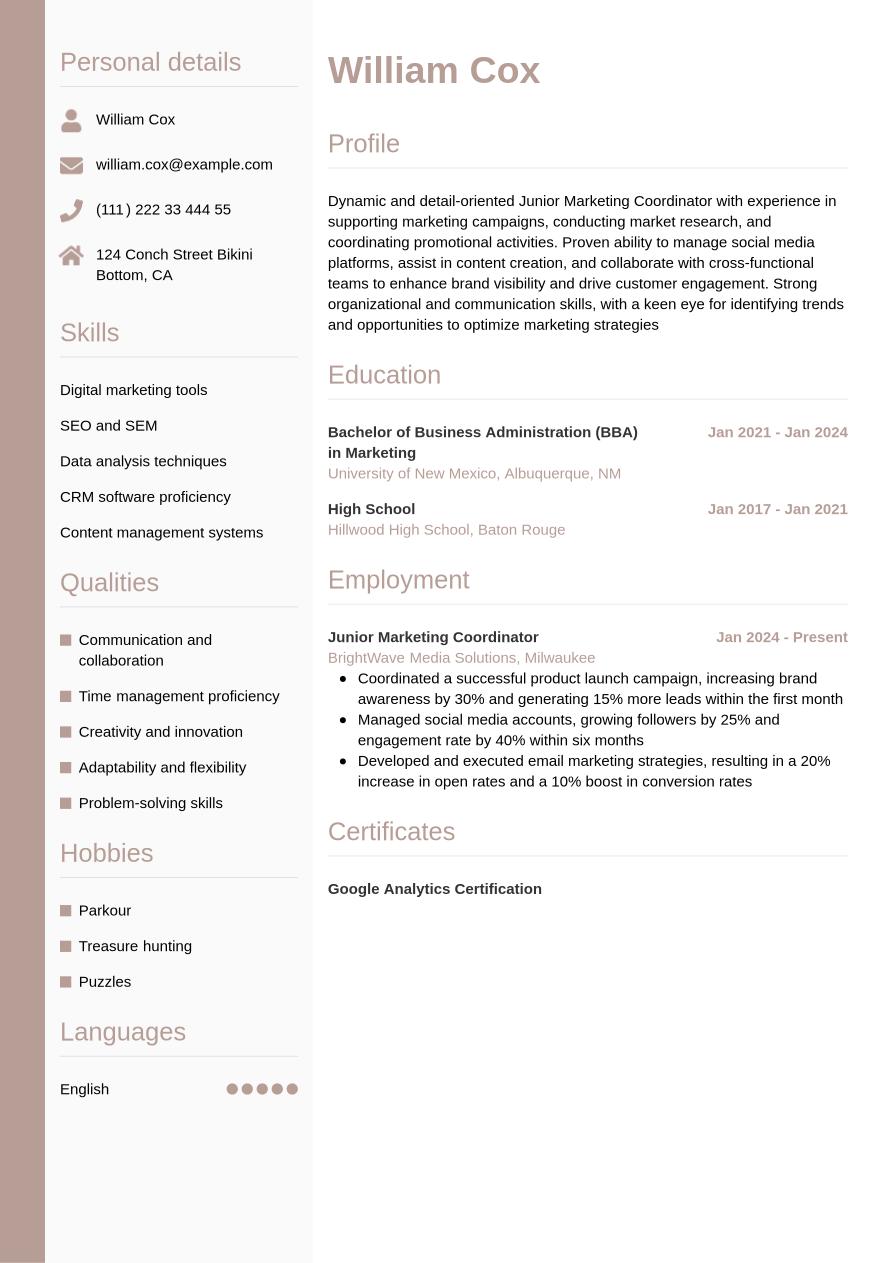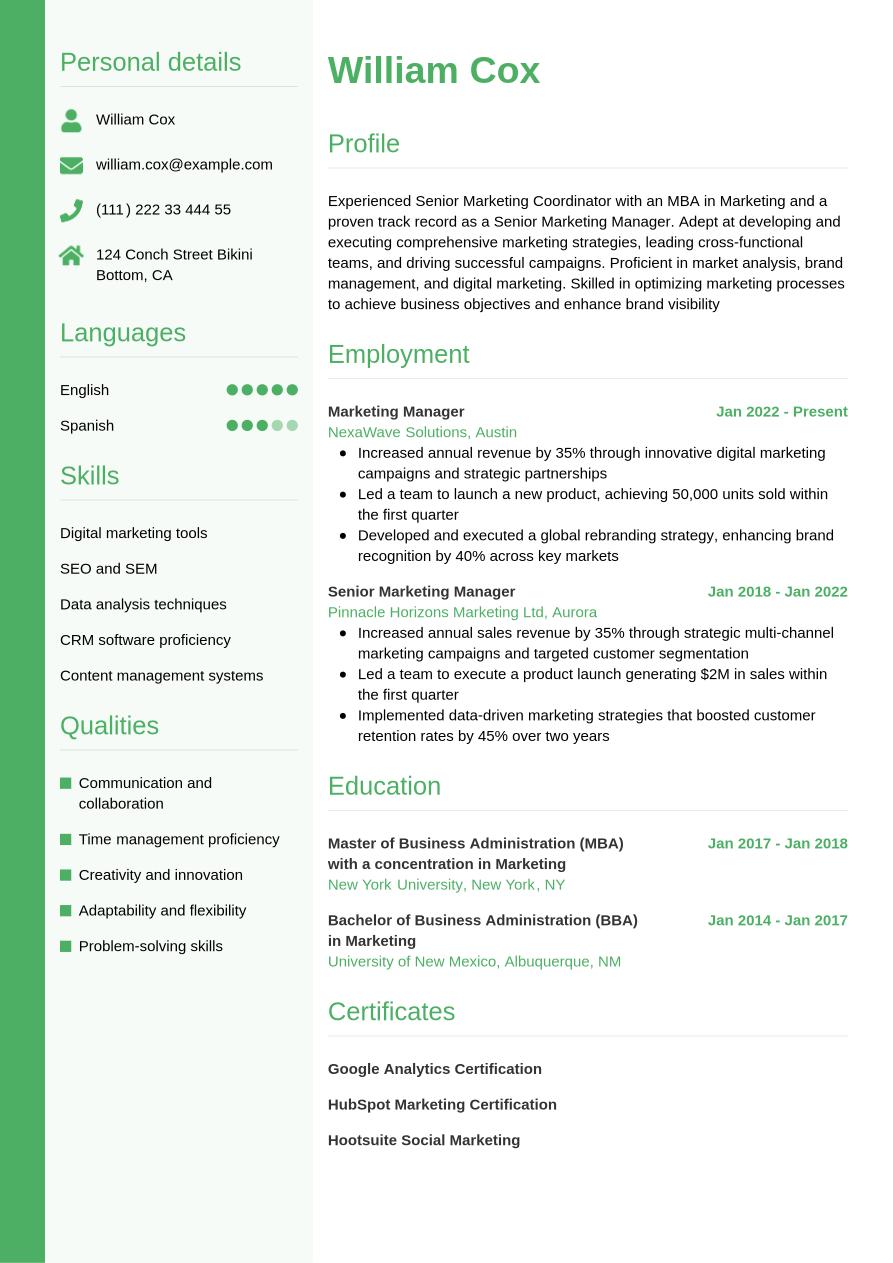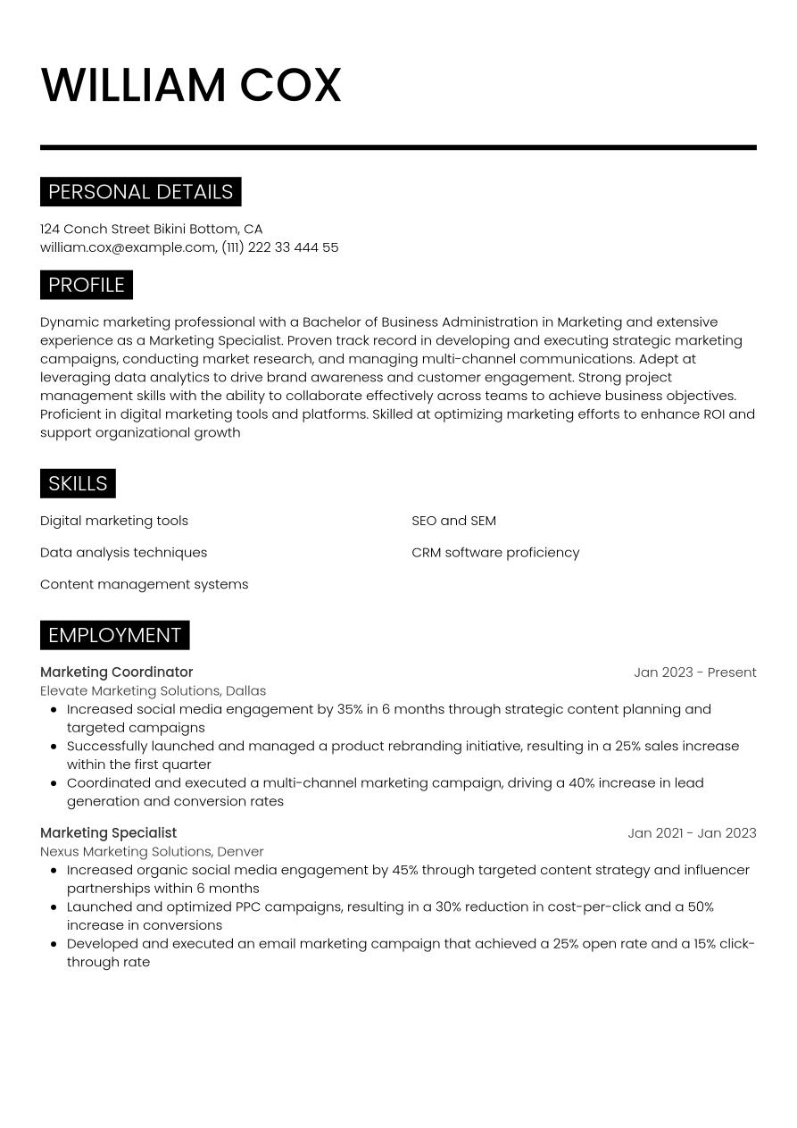 Using each of the sections above, we've created this example marketing coordinator resume, to help guide you when creating your own: