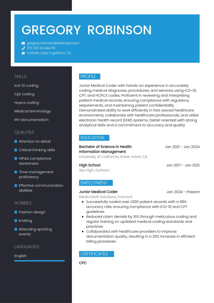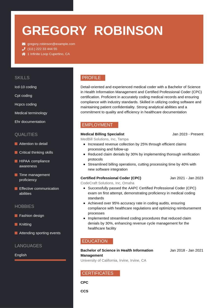 The key sections to include in a medical coder resume are similar to those for any role or profession.