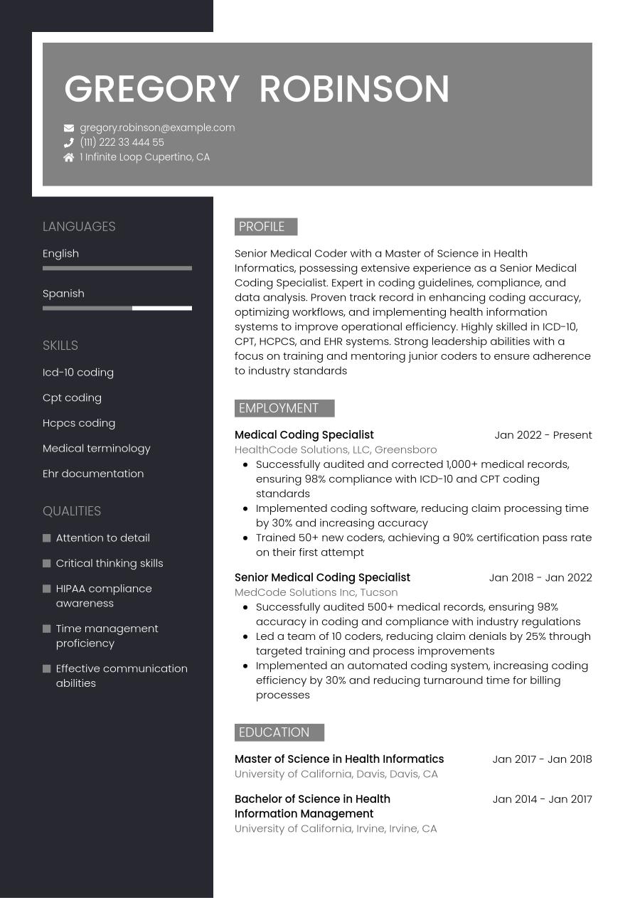 Now that you know everything that needs to go into your medical coder resume, let's review an example resume that you can use as a guide when creating your own: