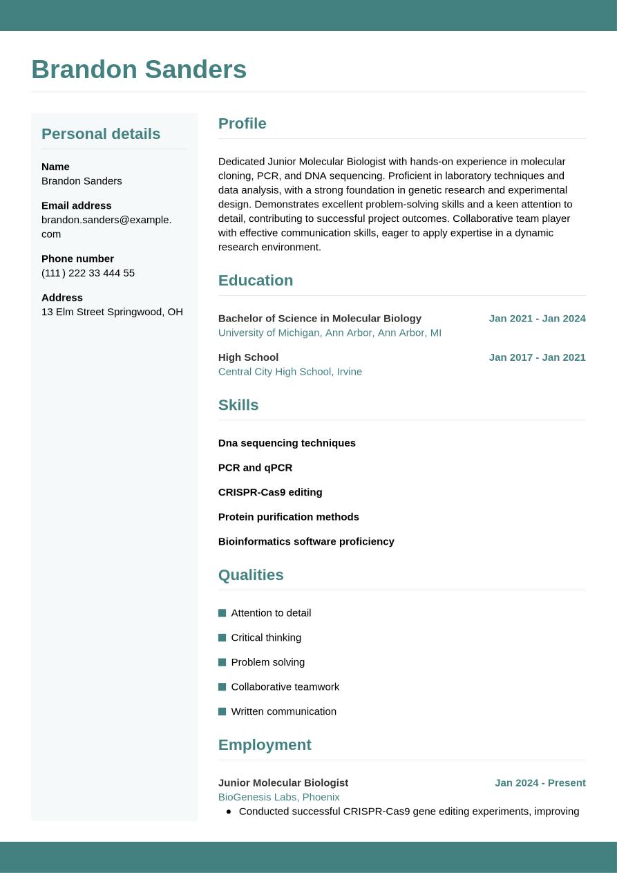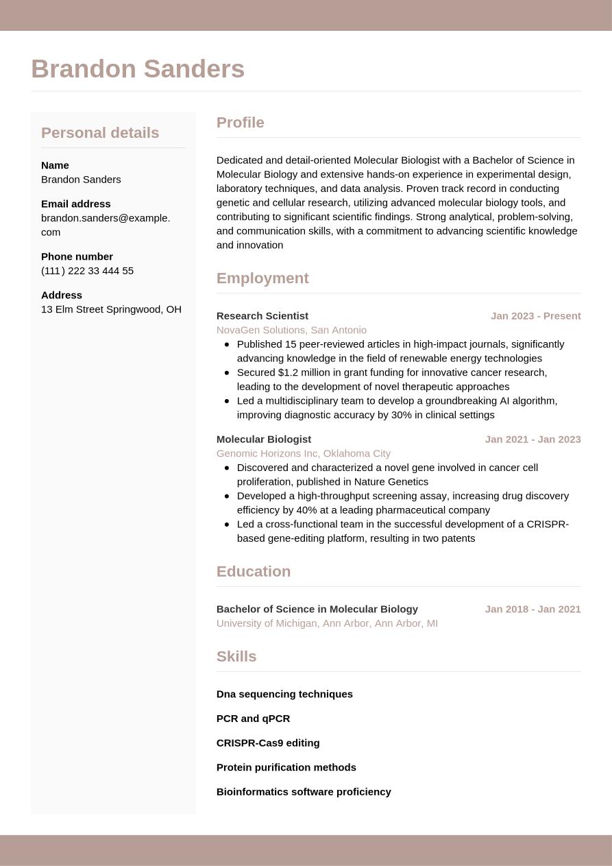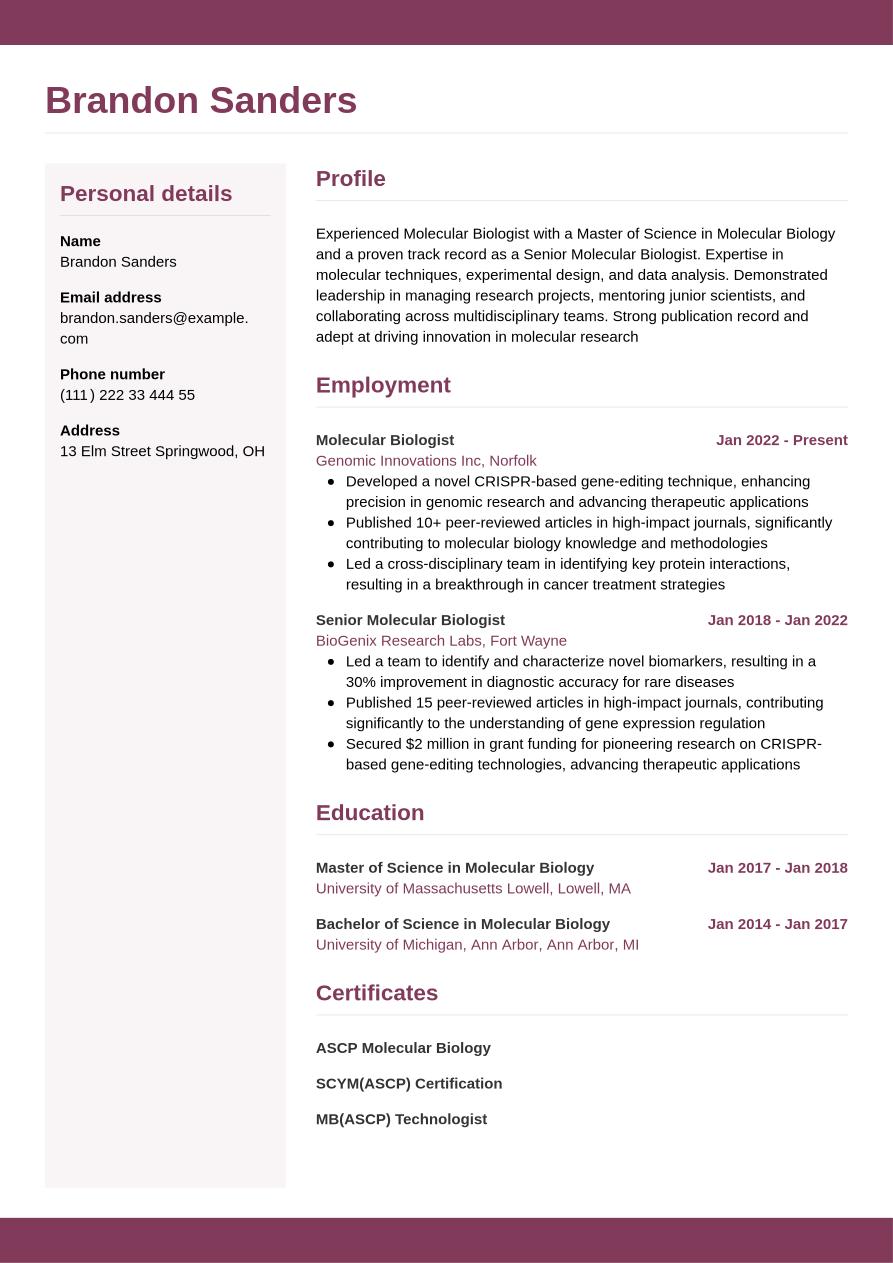 Now that you know everything that needs to go into your molecular biologist resume, let's review an example resume that you can use as a guide when creating your own: