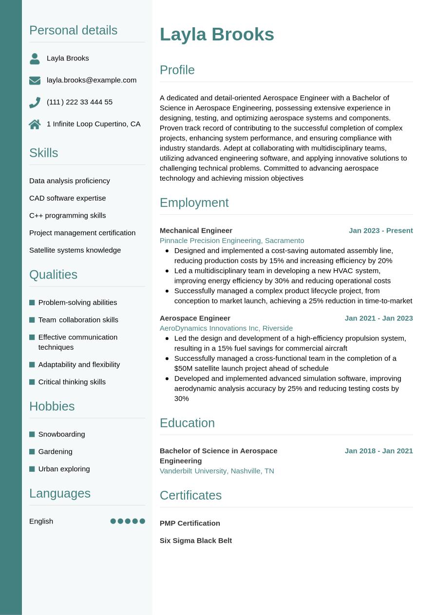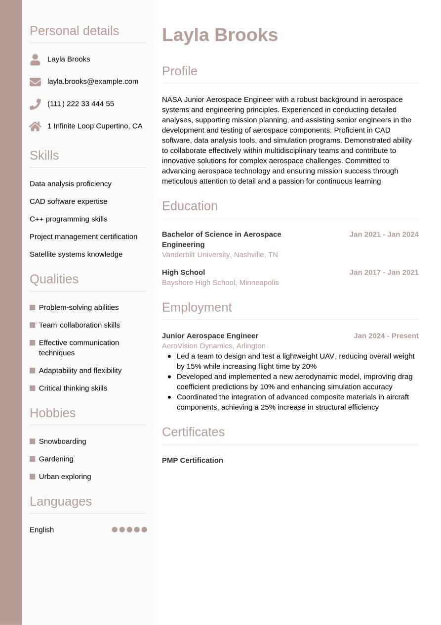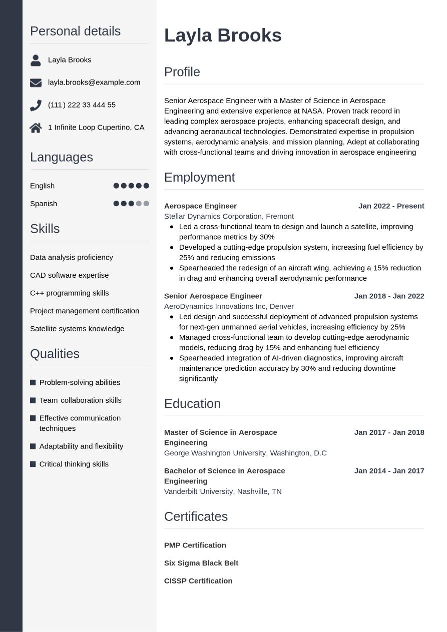 The NASA resume example below incorporates all the information from above into a full-designed resume template, so you can see how a final resume will look: