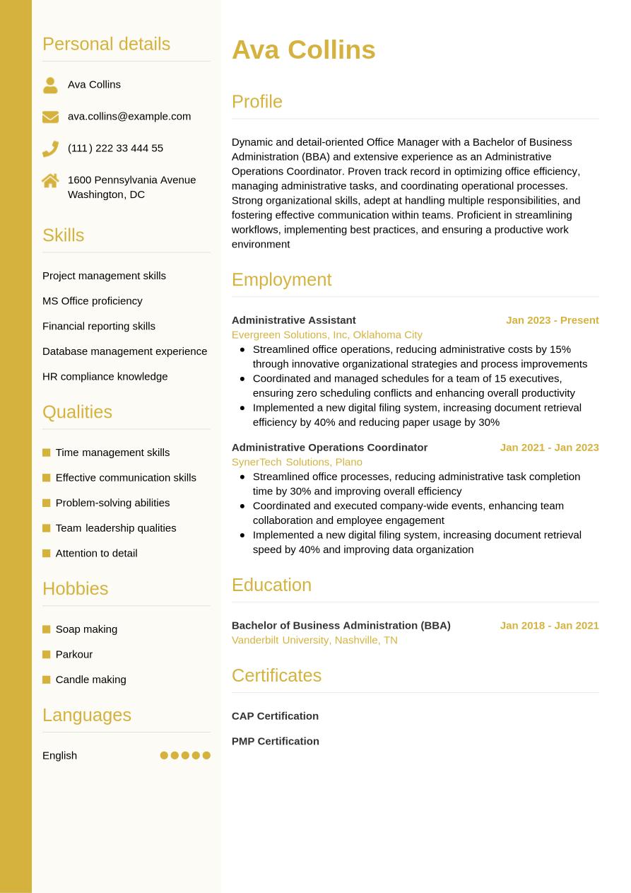 Your resume personal profile is a short, concise paragraph to highlight two or three key skills and achievements in office manager roles. You may also see this section named as 'resume summary' or 'resume objective'. Resume summaries tend to focus on your career experience, while resume objectives cover your ambitions and plans for the future. Furthermore, when writing your profile, focus on two or three key skills and achievements that showcase your suitability for office manager roles.